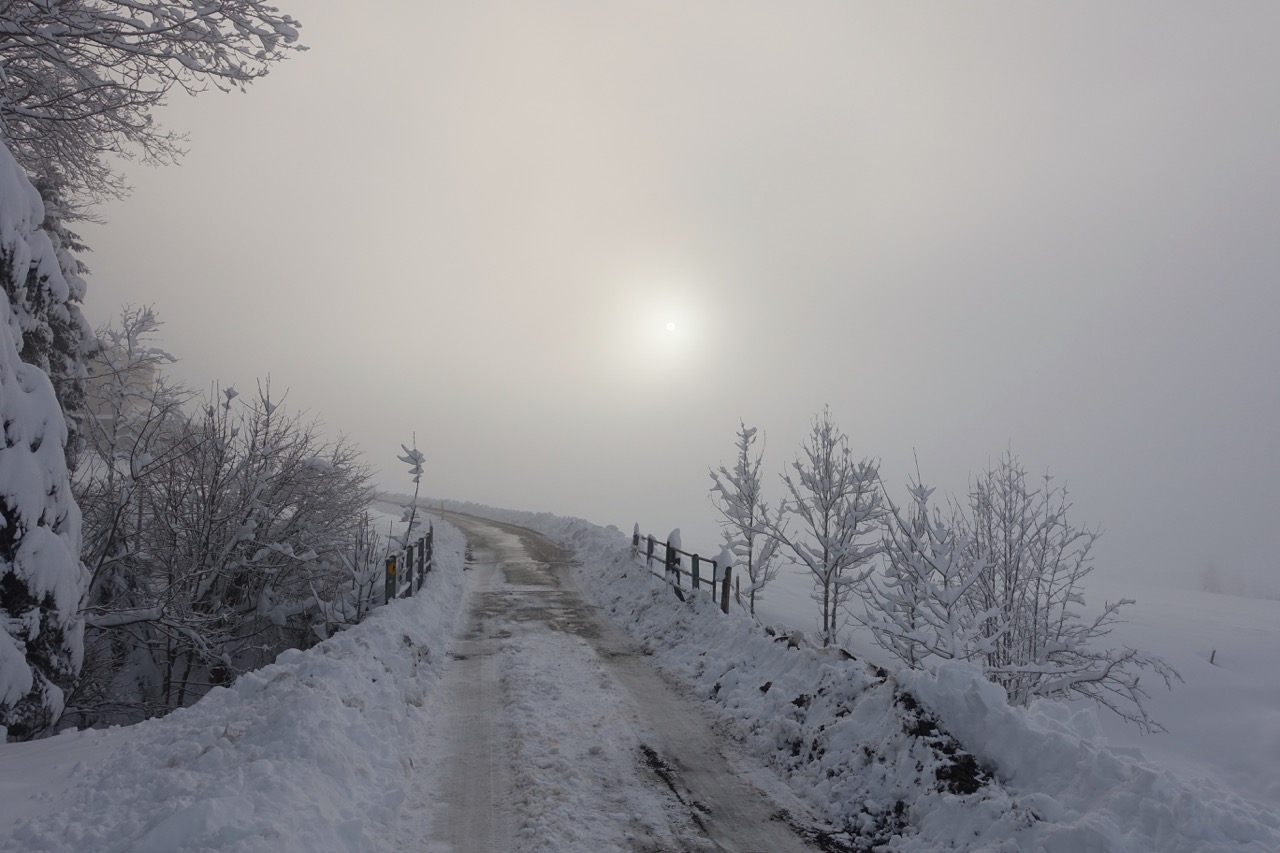 Die Strasse ins Tal hinein war zunächst schwarzgeräumt, nach zwei Kilometern nur noch weissgeräumt, aber immer noch prima zum Laufen.