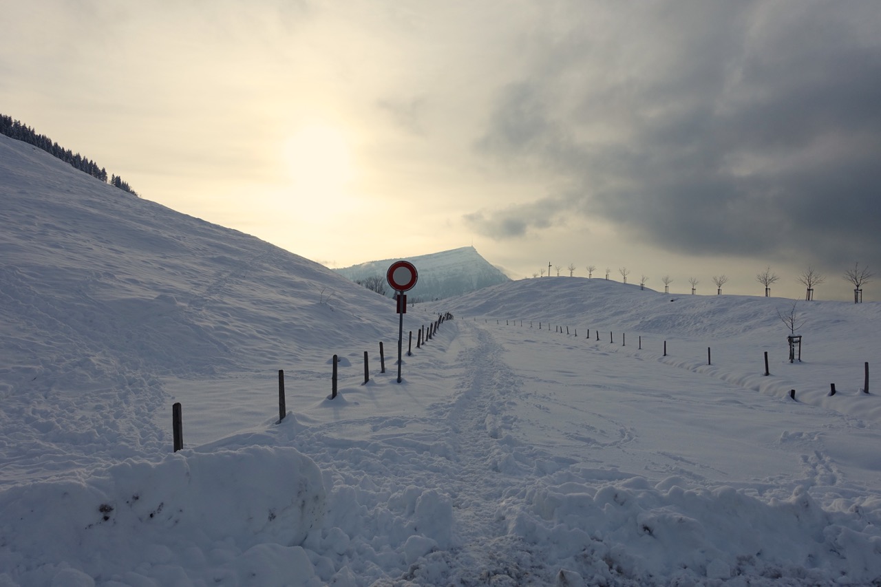 Bei der "Ochsenfeissi" macht der Weg dann eine scharfe Wendung nach Norden. Hier war die Strasse nicht mehr geräumt, aber zum Glück war heute bereits jemand schon vor mir hier durch, so dass ich in den bestehenden Fusstapfen gehen konnte.