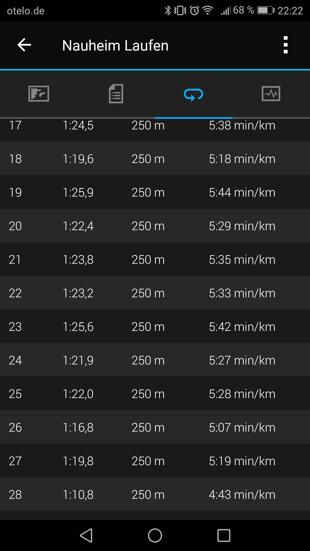 Runden blieben auf 250, so kann ich ganz gut meine Pace kontrollieren. In Klammerns sind eie Zeiten auf 1km hochgerechnet.