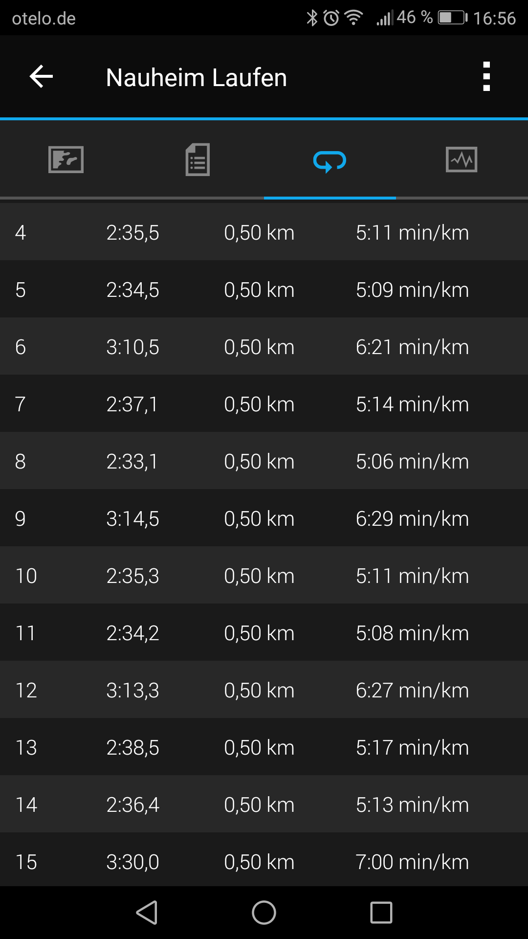 Die meisten zwischenzeiten passten dann auch, bis auf die 2 blöden Stellen an der Strecke. Zum Einen eine scharfe Kehrtwende von ca 150 Grad am Ende der start Ziel geraden und Dann gab es nach ca 600m eine etwas dunklere Gasse wo es ca 2m bergab ging und 150m später wieder bergauf. Geschätzte Steigung bzw Neigung 15% was mich leider fast jedesmal langsamer gemacht hat..... Hatte an beiden Stellen meine Probleme wieder die richtige pace zu treffen.