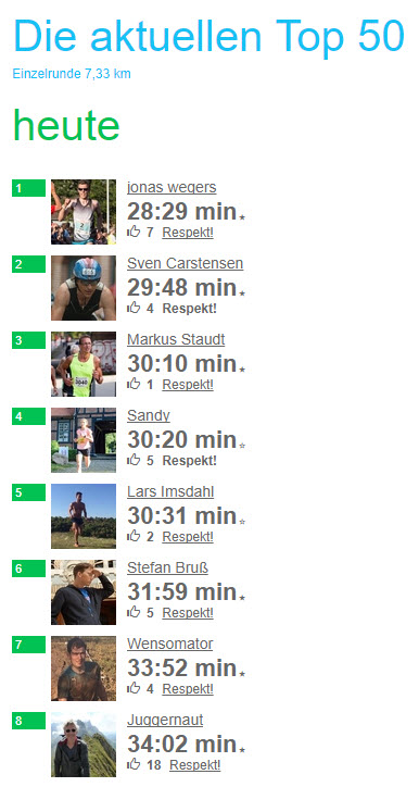 Heute mal wieder Gas gegeben und auf den 7,3Km eine 30:40 hingelegt (Durchschnitt 4:11)