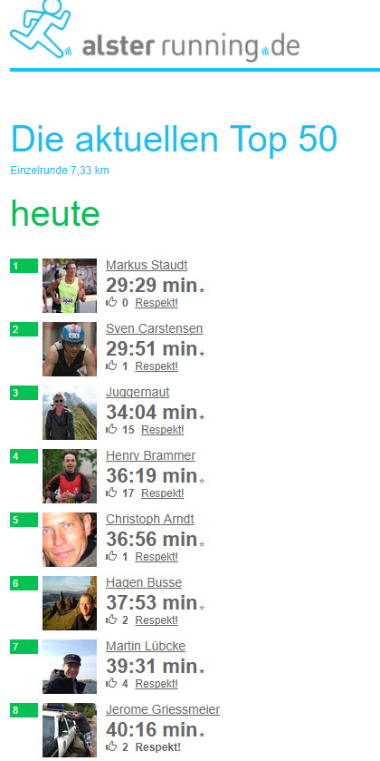 http://alsterrunning.de/standorte/ hat geschrieben:Unsere 6 Messstationen sind gleichmäßig rund um die Alster verteilt. Auf der 7,33 km langen Strecke erreichst Du immer nach 1,33 km oder 1 km den nächsten Standort.
