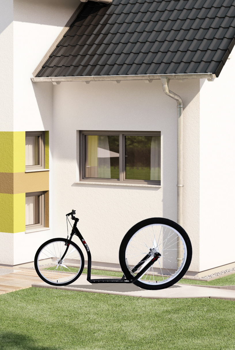 Ich finde ja, die Möglichkeiten sind mit 28/28 noch lange nicht ausgereizt und die Entwickler dürften ruhig noch etwas innovativer sein. Um die natürliche, gefällige Asymetrie des Tretrollers beizubehalten, aber trotzdem nicht auf die guten Rolleigenschaften des großen Hinterradumfanges verzichten zu müssen, drängen sich neue Wege geradezu auf: