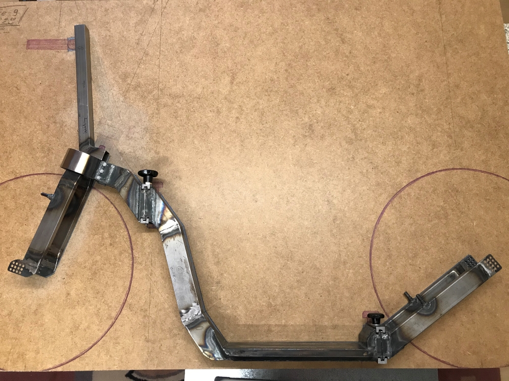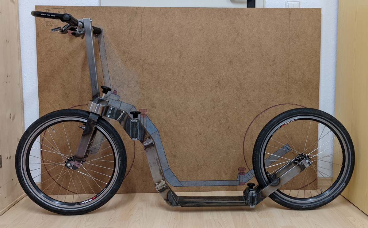 Damit teste ich die Rahmengeometrie (Steuerrohrwinkel, Radstand, Lenkerposition, Trittbretthöhe) und die Faltmechanik.