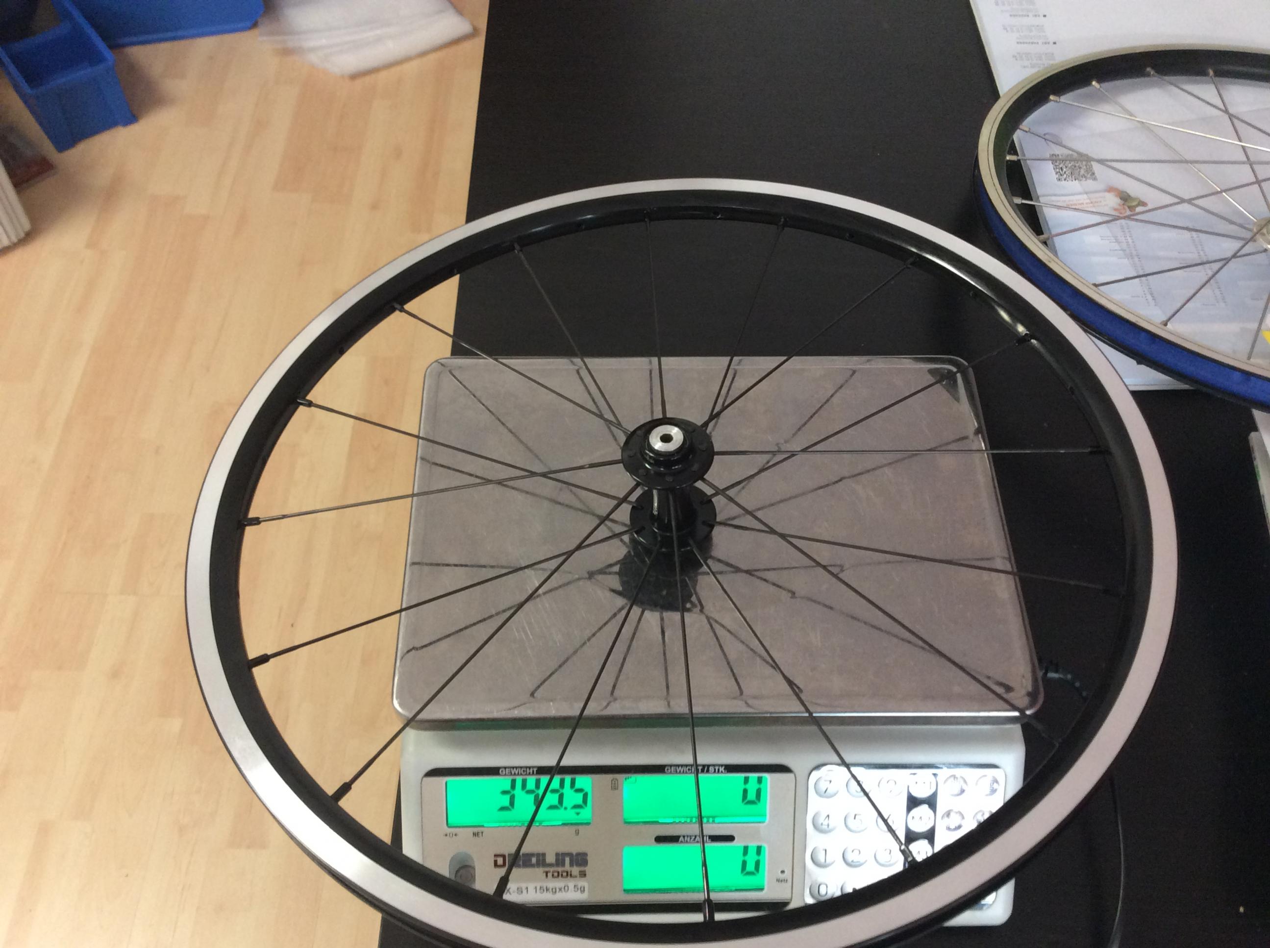 Anbei nur ein Beispiel des hinteres Laufrades. Erstaunliche Gewichtsersparnis. Trotz 16 Speichen steif genug. Nein, ich bin kein Spargeltarzan, sondern wiege 90kg.