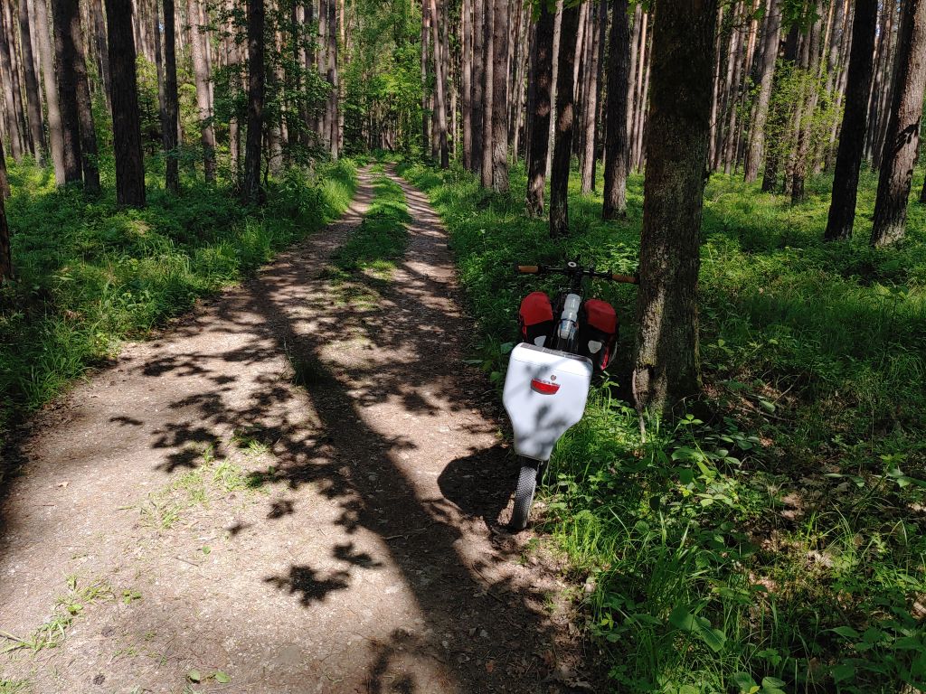 Gestern habe ich die erste richtige Testrunde mit 12kg "Gepäck" gemacht, 53km über Stock und Stein inklusive schneller Abfahrten auf holprigen Waldwegen. 6Kg im Koffer, 6kg in zwei Packtaschen mit je 1kg Eigengewicht am Vorderrad. Das Fazit