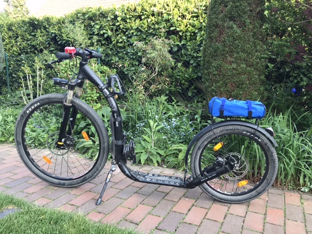 Bei Touren mit großem Gepäck finde ich das Fahrverhalten mit allem Gewicht auf dem Vorderrad nicht so besonders toll. Für die nächsten Touren denke ich darüber nach, ein Zelt mitzunehmen, was das Problem noch verschärft. Deshalb habe ich mir Gedanken gemacht, wie ich einen Teil auf das Hinterrad verlagern kann. Zu kaufen gibt es da nichts, was dem Tretroller gerecht wird, also selber bauen...