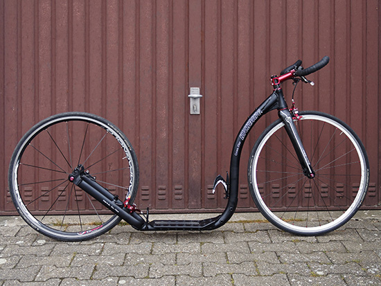 Na ja, es gibt auch nächstes Jahr noch Rahmen zu kaufen. Und so dringend brauche ich keinen weiteren Roller. Hab ja schließlich schon was. Wenn ich nur an Rennen interessiert wäre, hätte ich längst einen gekauft. Aber ob ein 28/28 oder 26/26 für Alltag / Touren / Cross Vorteile hat? So ganz überzeugt bin ich davon noch nicht. Obwohl es mich natürlich reizt, das einmal auszuprobieren. Aber dann gibt's ja auch noch den Revoo. Aus der Verlosung ist der noch nicht.Kollo hat geschrieben: Ich bin nicht sicher, ob es wirklich Sinn für Dich macht, mit dem Kauf zu warten, denn die Geometrie des 28/28er Rahmens ist doch etwas anders als die des 28/20, was am deutlichsten am Hauptrohr zu erkennen ist, das aufsteigend vom Trittbrett nun nicht mehr zunächst ein wenig in Richtung Fahrer verläuft (auch gut an der zum Fahrer zeigenden Trinkflasche zu erkennen), sondern nun etwas vorwärts gestreckter ist. Trotz leicht ansteigenden Trittbrettes zeigt meine große Trinkflasche sogar leicht nach vorne und nicht nach hinten, wie das beim Race Max 20 der Fall war.
