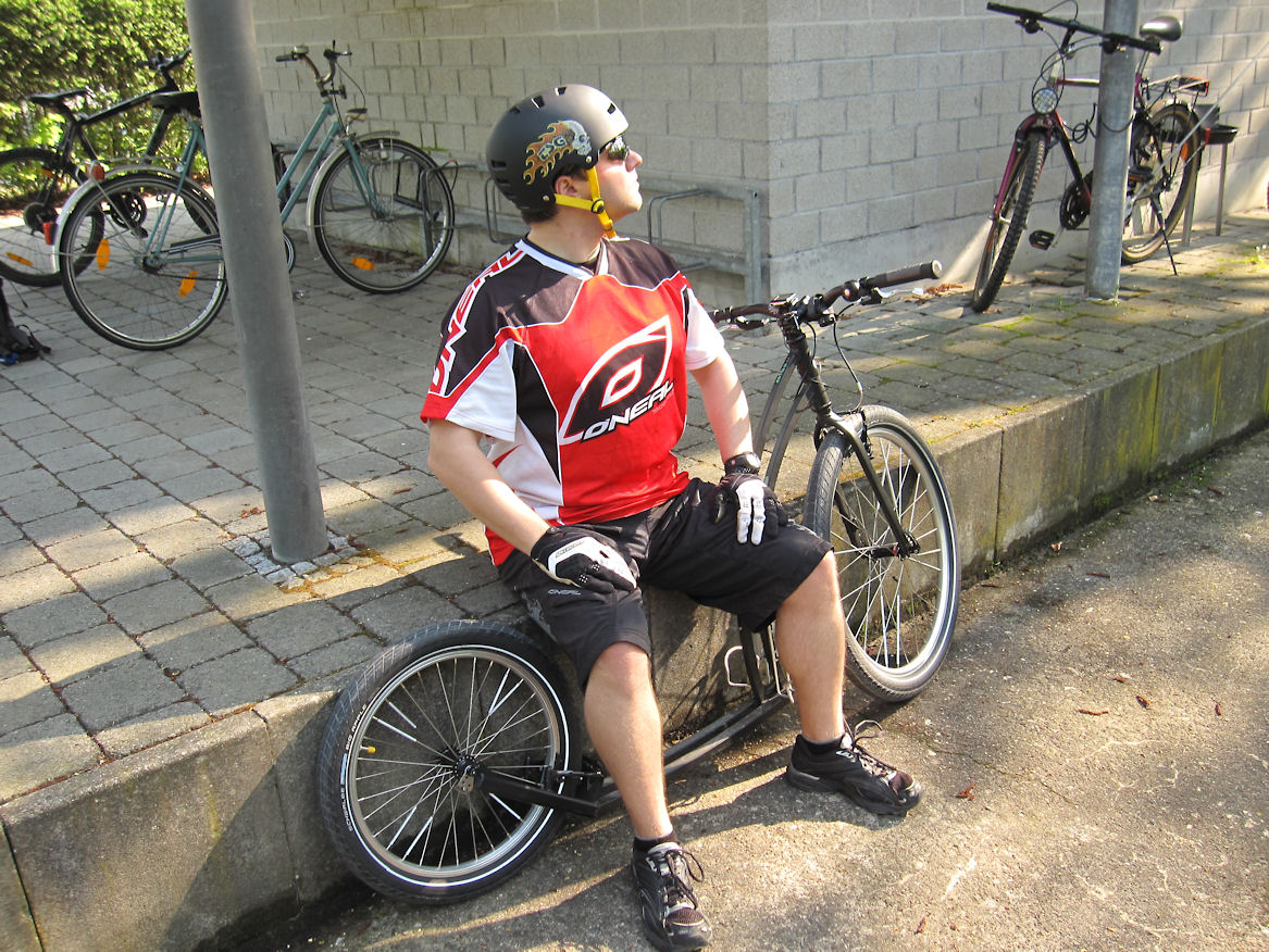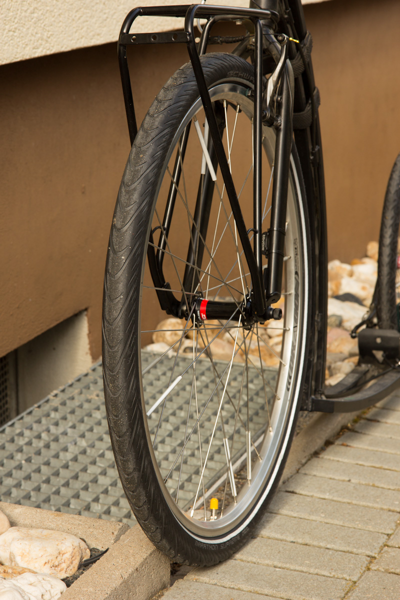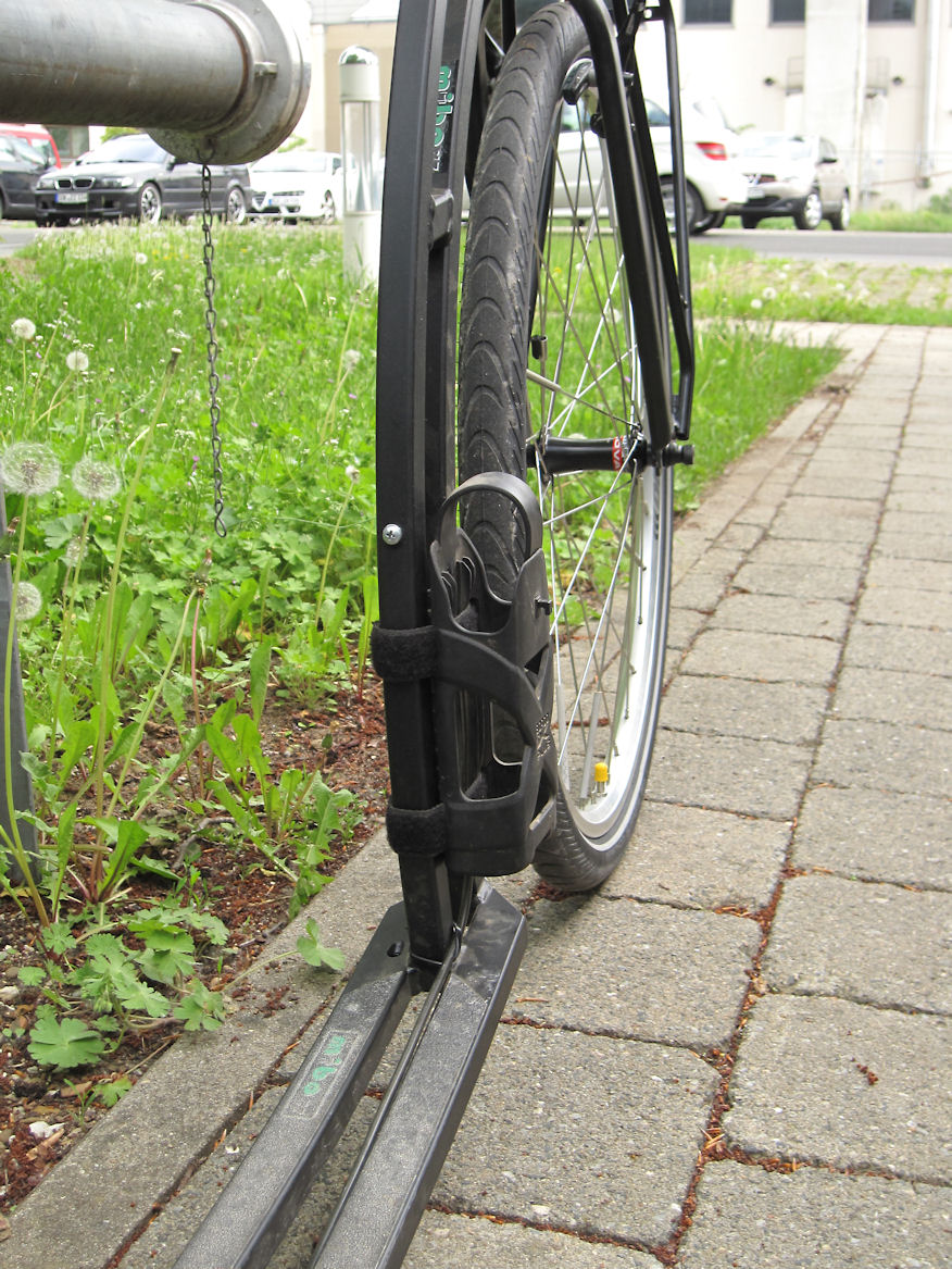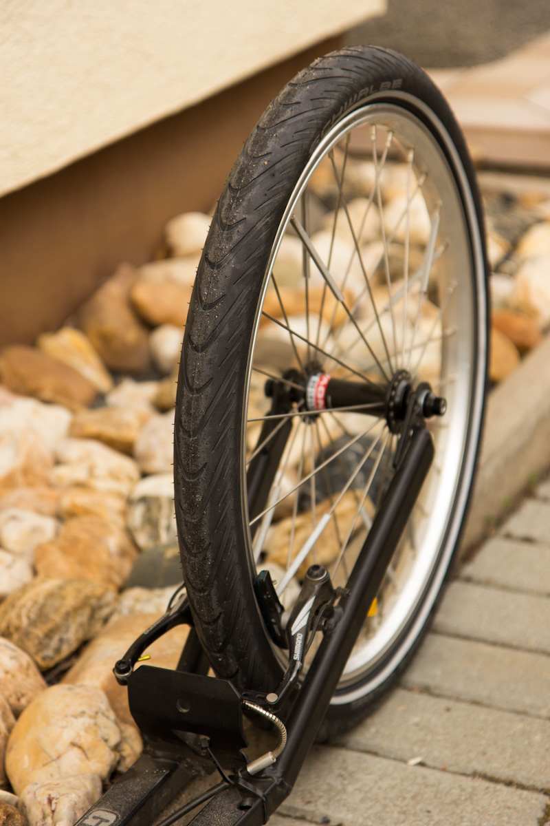 Übrigens: Beide Reifen auf 5 Bar sind übrigens nicht so hart wie gedacht, das ist noch fahrbar. Die lange Schramme stammt übrigens von einer Rechtskurve den Bordstein rauf. Das weiße an den Schweißnähten stammt vom Beton im Bastel-Keller. Ansonsten sind die üblichen Hindernisse auch mit 5cm Bodenfreiheit kein Problem, bei abgesenkten Bordsteinen und Regenrinnen setze ich nicht auf...
