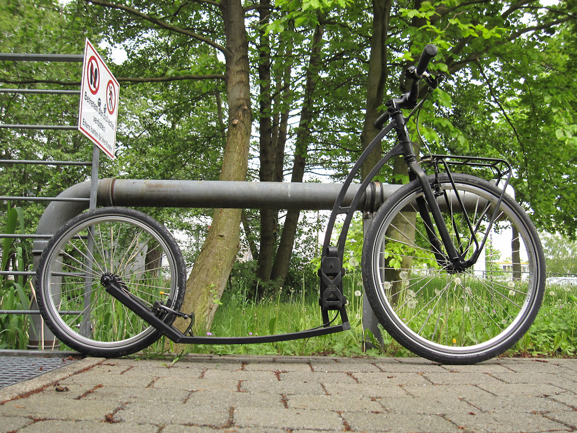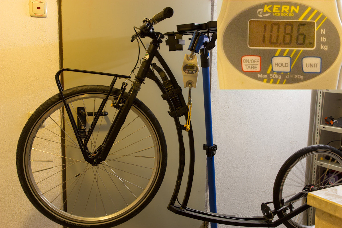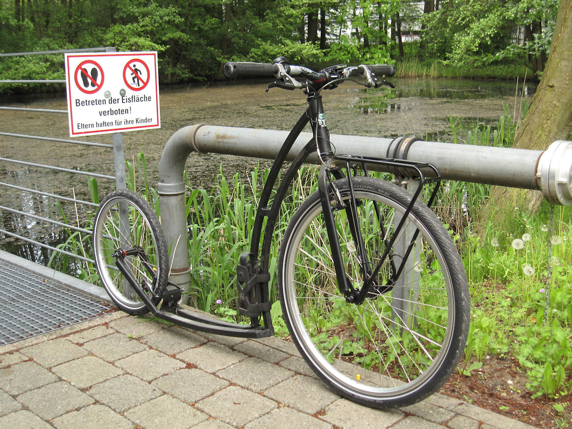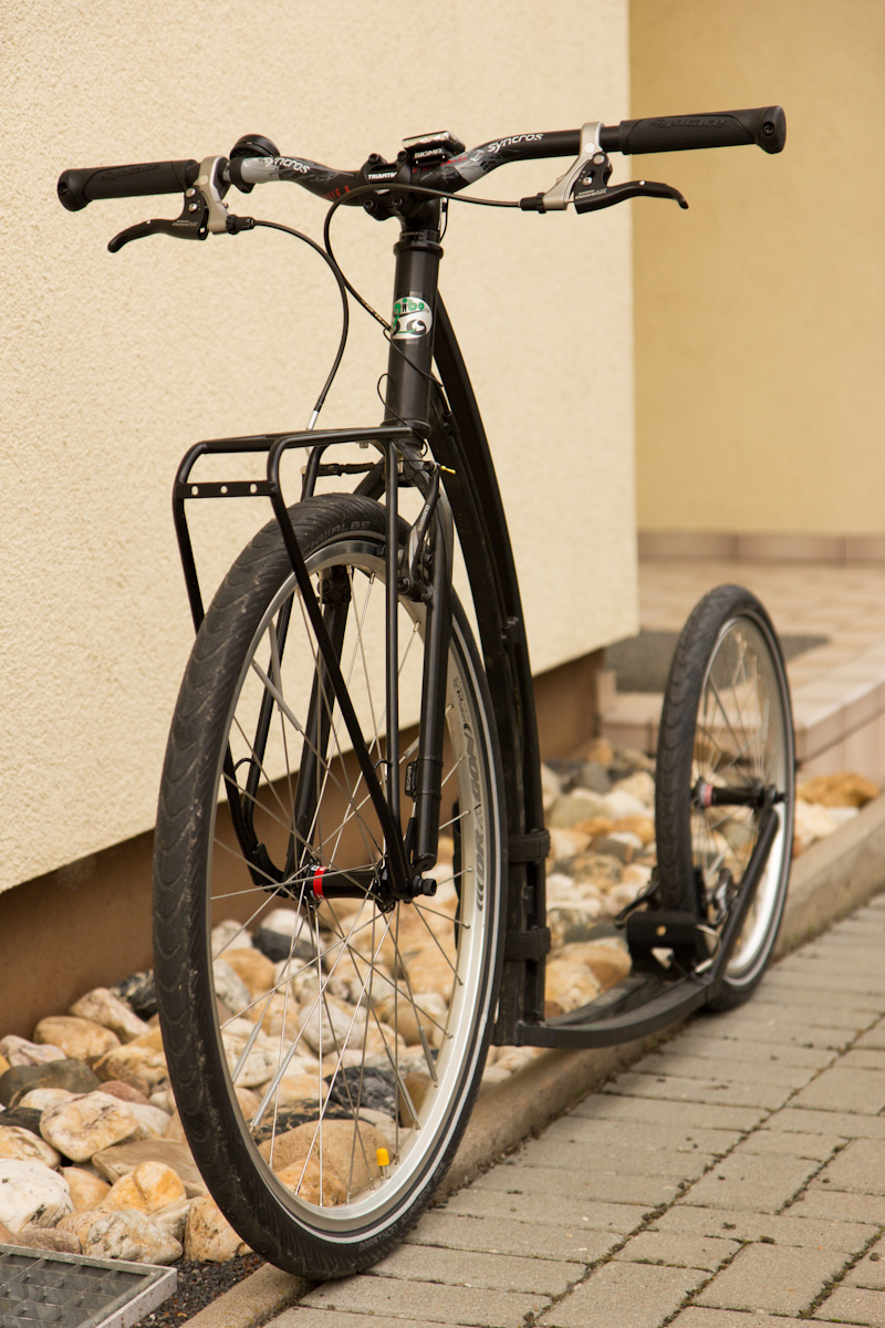 Übrigens: Beide Reifen auf 5 Bar sind übrigens nicht so hart wie gedacht, das ist noch fahrbar. Die lange Schramme stammt übrigens von einer Rechtskurve den Bordstein rauf. Das weiße an den Schweißnähten stammt vom Beton im Bastel-Keller. Ansonsten sind die üblichen Hindernisse auch mit 5cm Bodenfreiheit kein Problem, bei abgesenkten Bordsteinen und Regenrinnen setze ich nicht auf...