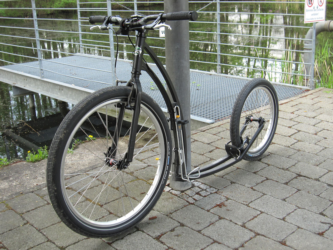 Die Gabel flext schon deutlich bzw hat auch etwas Spiel im Steuersatz, aber es ist ja a) ne Stahlgabel und b) stört es beim rollern nicht. Ersatz mit einer EBL von 400mm oder etwas weniger zu finden ist schwierig, vor allem wenn man so Dinge wie Lowrider-Ösen oder Scheibenbremsaufnahme haben will. Die originale Gabel ist halt recht simpel gestrickt - dafür ist die bei den V-Brakes ziemlich steif, einen Brake-Booster braucht man nicht...Wenn du die Bremse ziehst und versuchst den Roller vor und zurück schieben, wie dolle flext die Gabel vor und zurück?