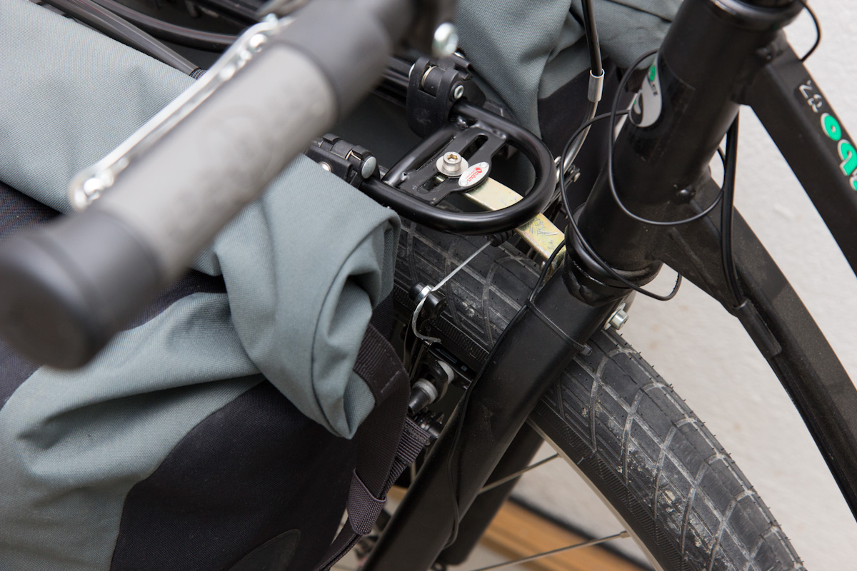 Zur Befestigung oben an der Gabel habe ich einen Brake-Booster vor die Cantilever montiert. An diesem - allerdings auch nach hinten zur Gabel abgespannt - habe ich den Träger mit Kabelbindern fixiert. Das ergibt mehr Auflagepunkte als bei der Ein-Punkt-Befestigung am Mittelloch der Gabel.