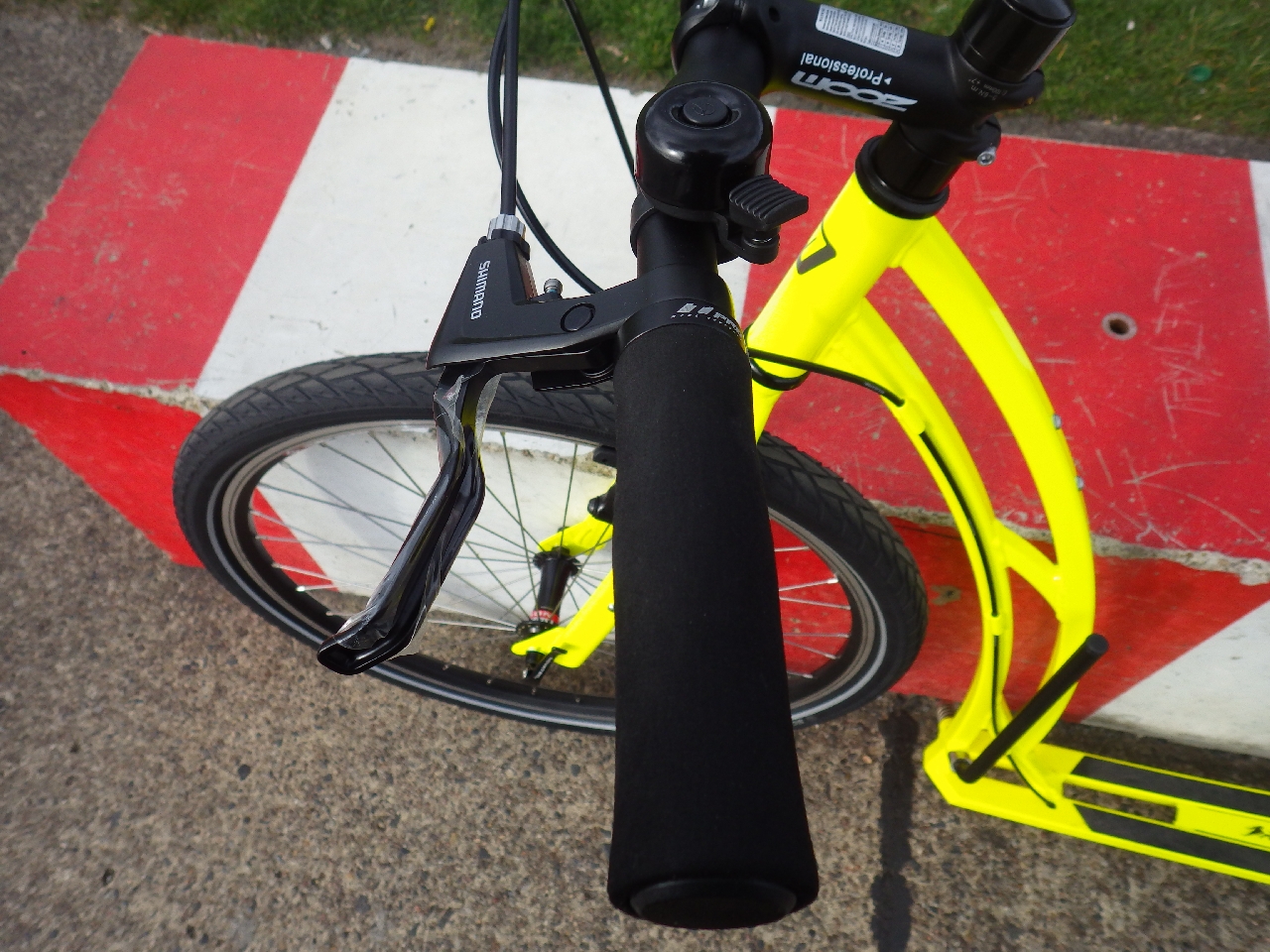 Diese Anpassung für Zwerge hat nun definitiv gelitten. Ich habe gleich von vorneherein einen Spacer nach oben gebaut und den Vorbau habe ich negativ eingebaut. Trotzdem habe ich mich als Zwerg auf dem Malaga gefühlt, als ob ich im Tretroller stehe und nicht drauf. Ich war hier immer geneigt, die Füße soweit vorne wie möglich zu haben. Die Rohre am vorderen Brettende sind jetzt nicht mehr senkrecht. Sondern das eine Rohr verläuft schräg. Meiner Meinung nach wird dadurch der Rahmen deutlich stabiler. Aber für Zwerge ist das nix. Die treten immer mit dem Fuß auf das Schrägrohr. Wohlgemerkt, auch nach dem Umbau. Auch ist der Lenker auch nach dem Umbau für Zwerge immer noch viel zu hoch.