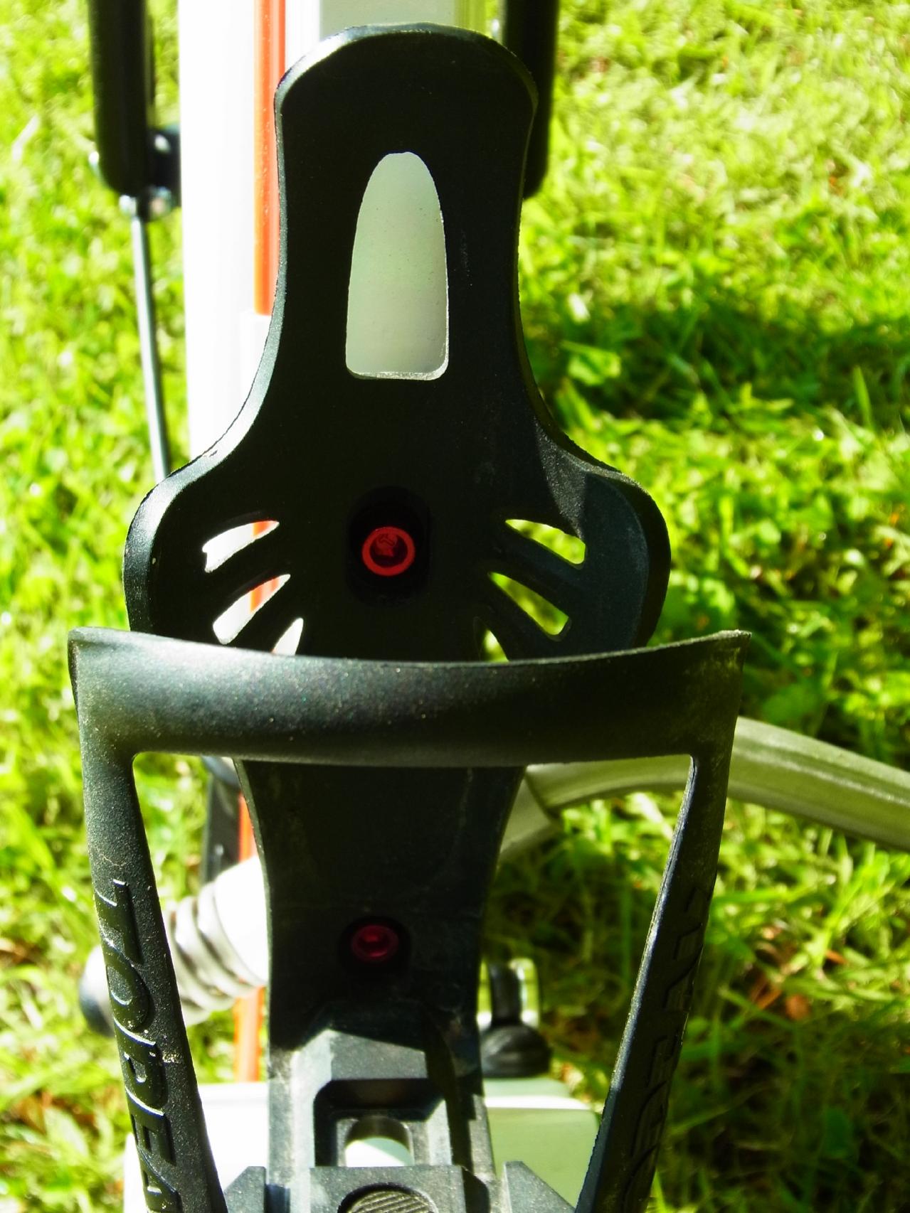 Der weiße Flaschenhalter würde auch gut zum blauen Rahmen passen, meine Frau wollte trotzedem den alten von ihrem Kostka benutzen.Er funktioniert sehr gut, auch für 0,7 L CamelbaK Better Bottle, sieht gut aus /beschichteter Blech mit carbon look/ und war billig. Da dieweißen Schrauben nicht existieren, gab Pechr die goldenen, damit die zu goldenen Bowdenenden passen