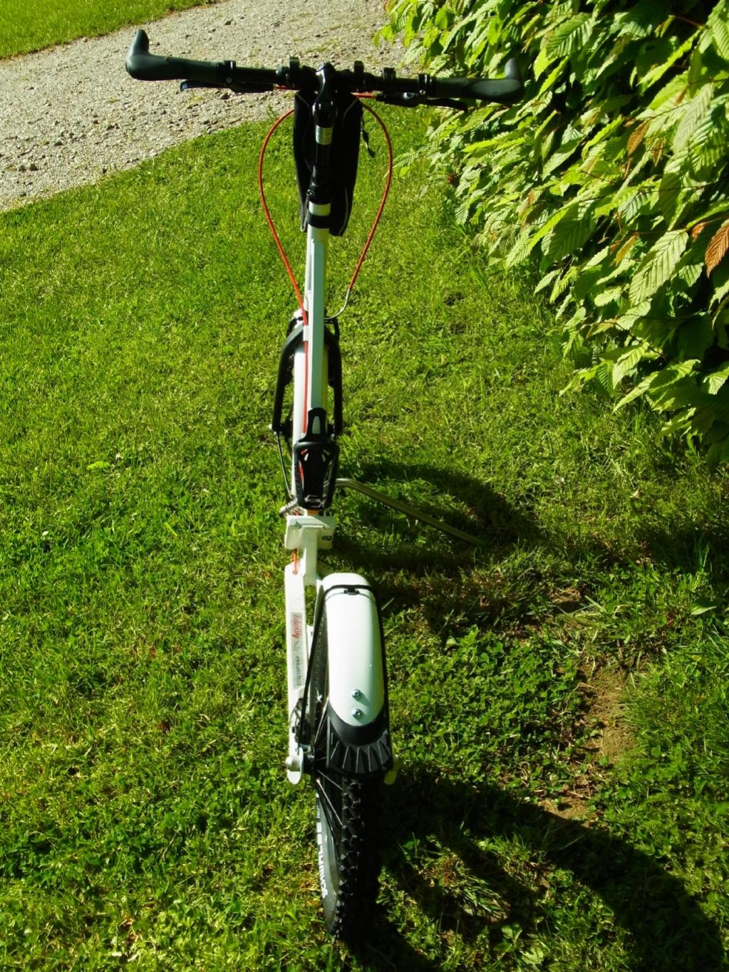 Hier der ist Lenker eingeklappt. Es ist eine kleine Tasche dran. Es werden einfach die beiden Schnellspanner geöffnet. Dann werden die Lenkerarme nach unten geklappt. Ist der Lenker oben, rastet er ein und wird mit den Schnellspannern sicher fixiert. Diese könnte man auch durch Schrauben ersetzen. Der Lenker ist steif und stabil wie ohne Knickmöglichkeit. Ich sehe nicht, daß das Knickgelenk bald ausgeleiert sein könnte.