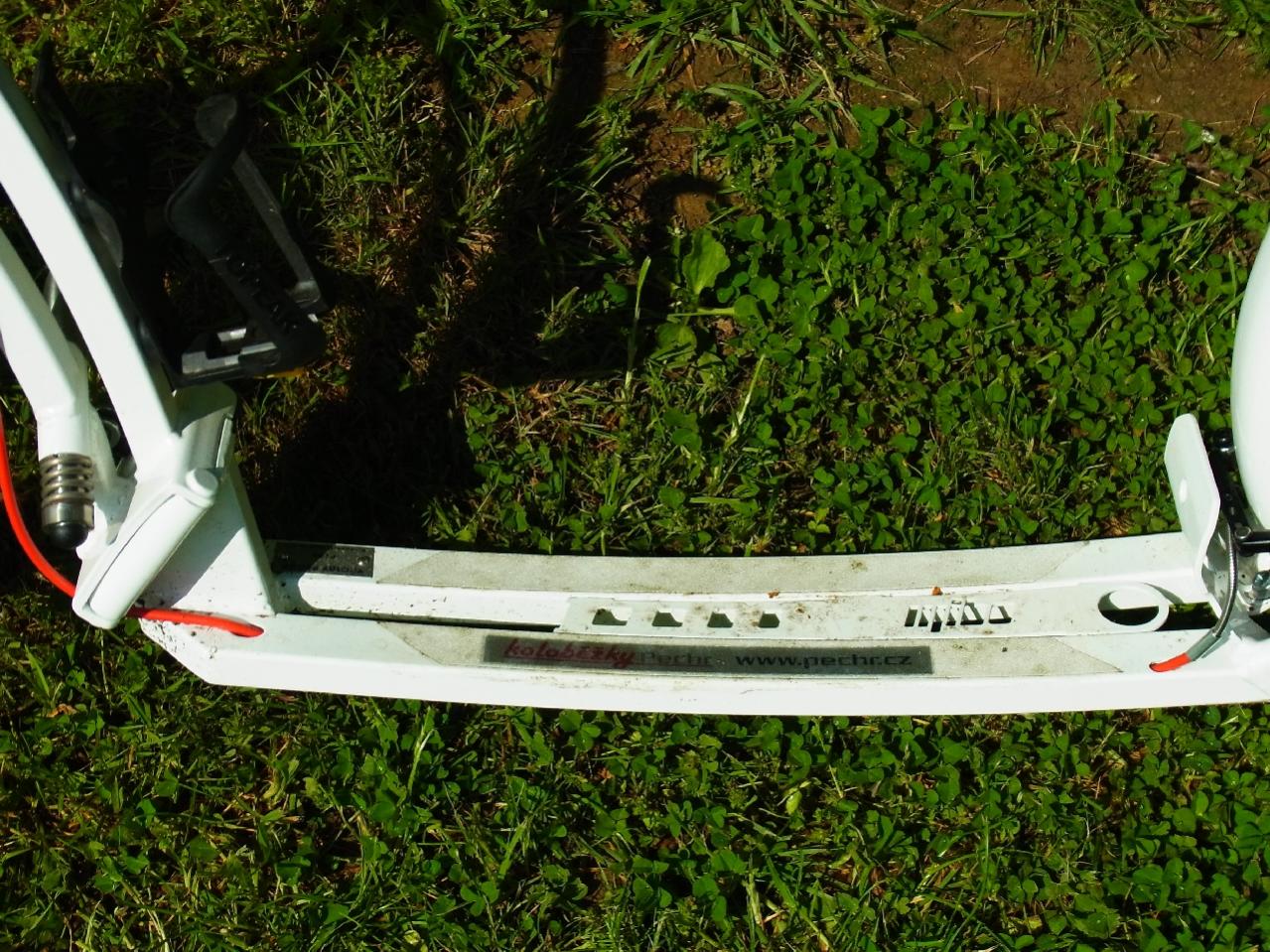 Das Brett hat hinten das große Loch, um einen einfachen Gewindegabellenker einzuklemmen. Hier nicht nötig, stört aber auch nicht. Fährt sich auch nicht anders als mein Master. Also jederzeit souverän. Das Brett scheint ein paar mm tiefer zu sein als bei mir. Der Ständer funktioniert gut und man kann ihn mit dem Fuß bedienen. Er ragt aber etwas nach oben über den Doppelrahmen hinaus. Davon bin ich nicht so begeistert. Wegen der Klappbarkeit ist der Ständer bei diesen Rollern rechts, sonst an den anderen Modellen immer links.