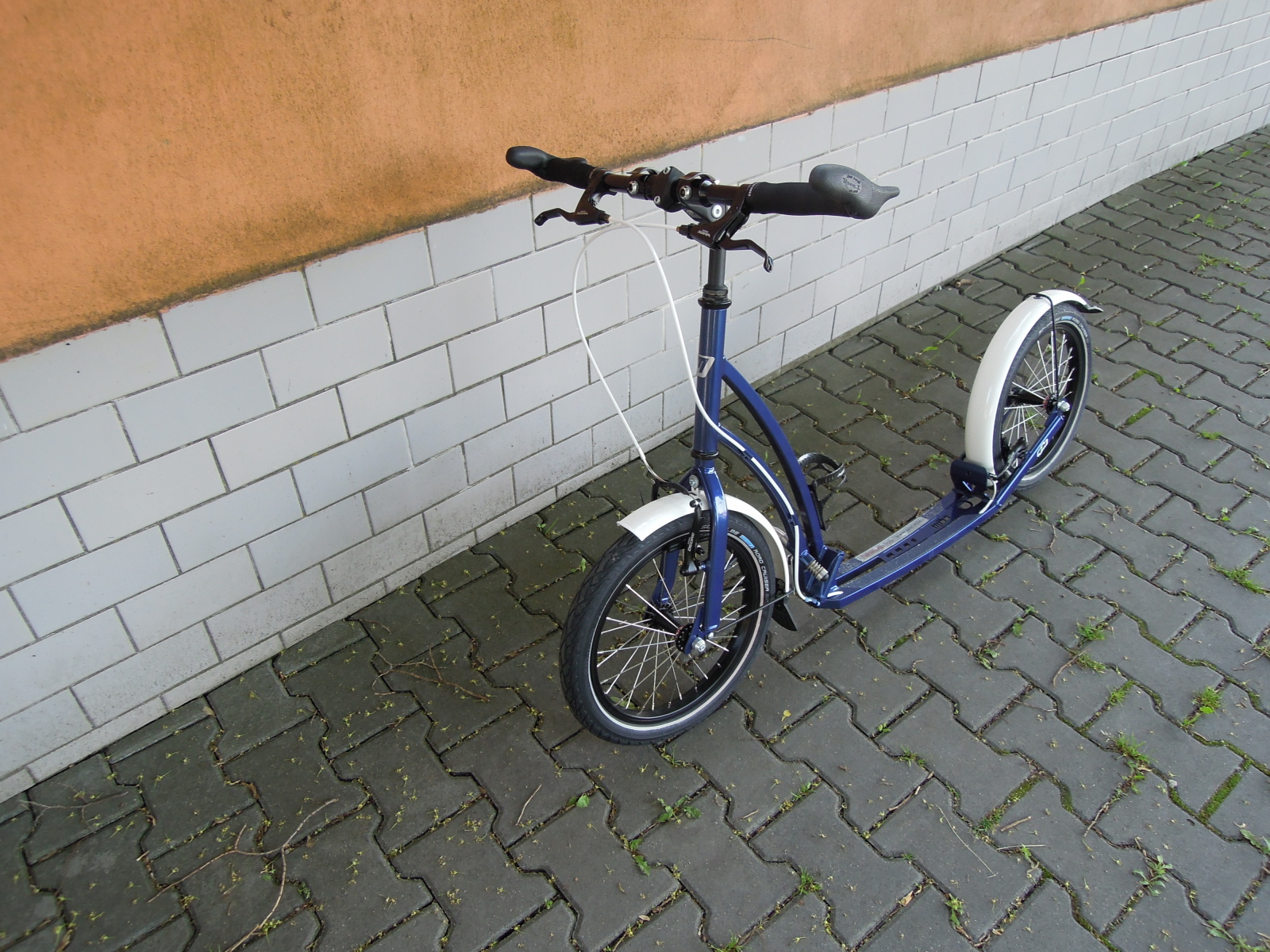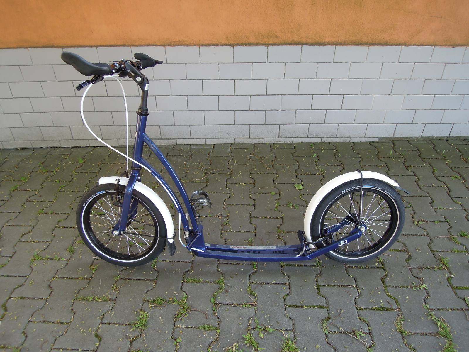 Der wird dann auch so schön blau, täte aber noch weiße Griffe (zum Dreckigwerden) und einen weißen Flaschenhalter bekommen. Mini-Roller mit 1,5-Liter-Flasche