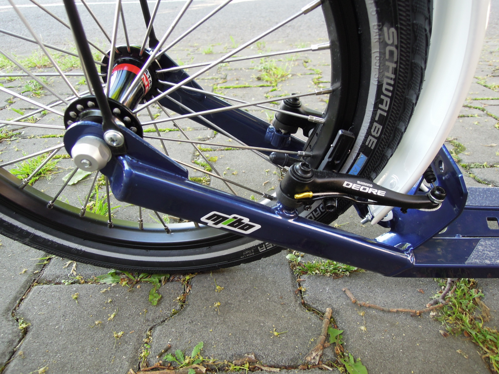 Wie bei allen Top-Modellen kommt dieser Roller mit Deore-Bremsen. Das Steuerlager wurde getauscht gegen ein gutes von BBB. Die Inbusachsen kommen auch gut. Hier gäbe es aber mit roten oder schwarzen Inbusachsen noch Verbesserungsspielraum.