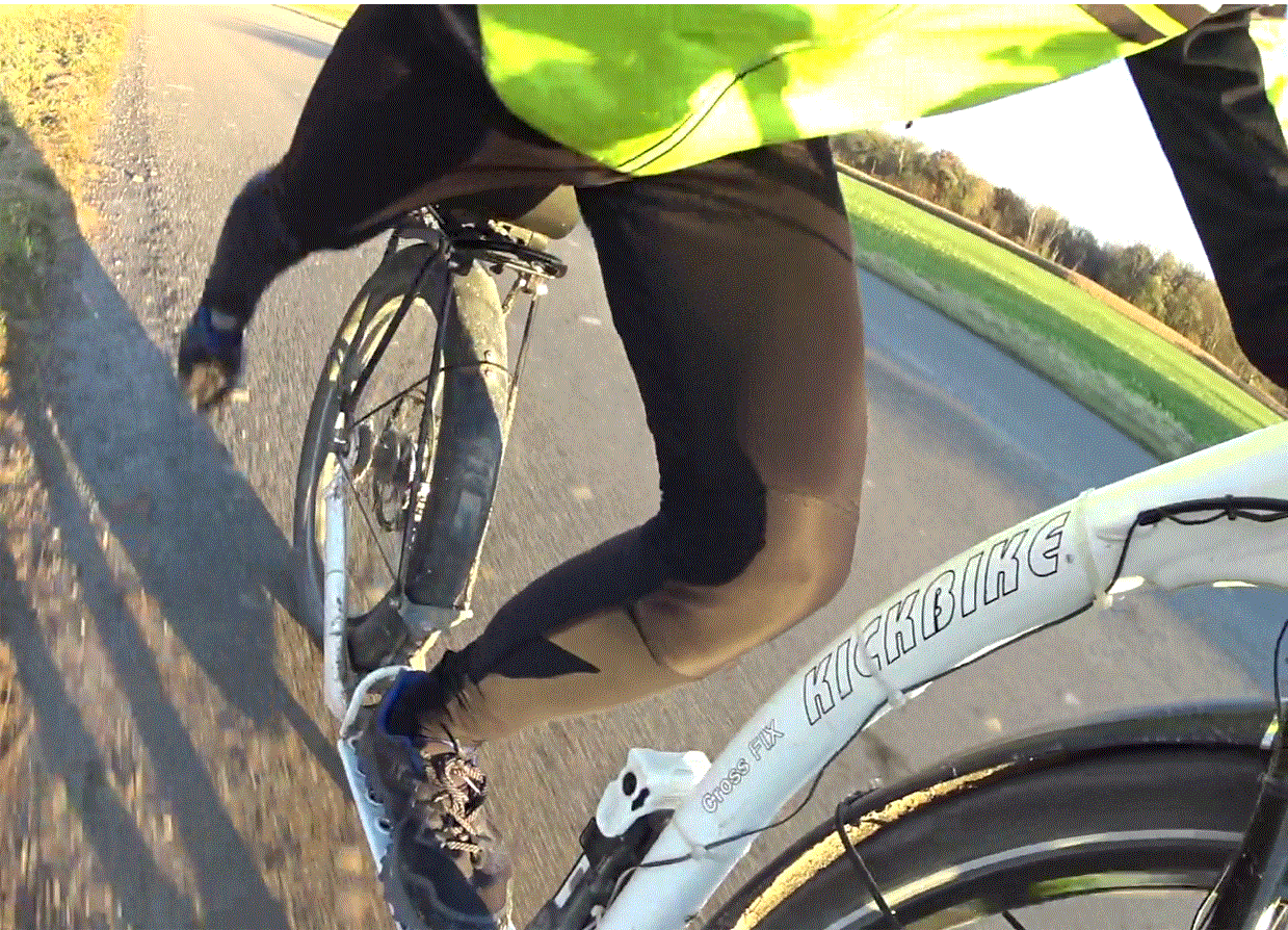 da der Hinterradgepäckträger mitsamt Tasche ja recht sperrig aussieht, habe ich mal bei 25 km/h die Kamera mitlaufen lassen und drei Fotos aus einer Abstoßphase rausgezogen. Der Gepäckträger ist mit einer Breite von 120 mm nicht im Weg. Da komme ich dran vorbei, auch wenn ich mit dem Fuß dicht neben dem Trittbrett aufsetze. Die Tasche streife ich manchmal ganz leicht, was aber nicht weiter stört. Wer größer ist als 1,75 m, muss evtl. den Gepäckträger bzw. die Tasche weiter hinten platzieren, damit er sich bei sportlicher Fahrweise nicht auf die Tasche draufsetzt.