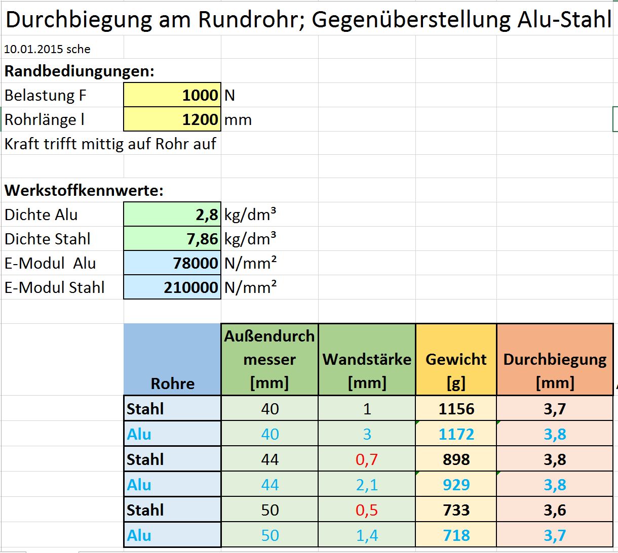 - bei gleichem Außendurchmesser und gleicher Durchbiegung ist ein Stahlrohr auch in etwa gleich schwer wie ein Alurohr!