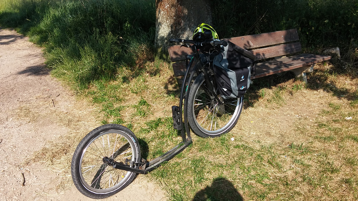 Bei mir hatte es das Vorderrad erwischt, so dass ich den Roller wenigstens quasi stehend schieben konnte (das Hinterrad rollte ja noch problemlos). Und ich hatte keine Ersatzschläuche dabei, sondern selbstklebende Flicken. Allerdings war das nette Druckausgleichsloch, dass durch einen winzigen Metallnagel (ähnlich wie bei Manuel) verursacht wurde, so klein, dass ich es nicht in der Wildnis lokalisieren konnte, obwohl ich ungefähr wusste, wo der Nagel steckte...