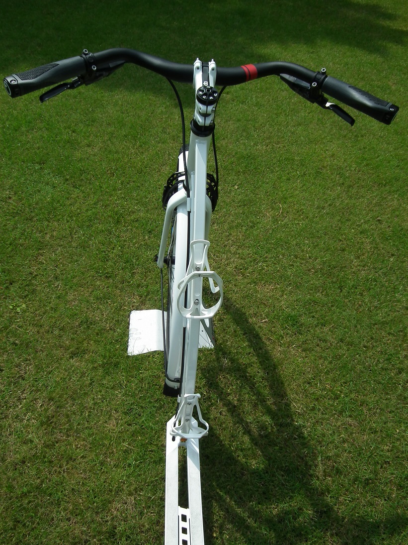 Der Halter von Zefal (Gizmo universal) sieht bekloppt aus und hatte ein kurzes Leben. Die Bandagen und Ringe sind aus Plastik und knickempfindlich. Man muss die Bandage an das Rohr drücken und dann den Ring spielfrei überziehen. Der Flaschenhalter ’sitzt’ anschließend auf den ca. 1cm hohen Ringen über dem Rohr. Nach 24h war das Ding kaputt, denn als ich mit dem Knie beim Fahren an die Flasche kam, riß eines der Bänder. Grund: Die Bandagen müssen für eine feste Anbringung am Übergang vom Rohr zum Ring stark gebogen (!) werden. Durch die erhöhte Anbringung wirken Kräfte auf den Falschenhalter wie über einen Hebel auf die Bandage (Erklärungsversuch).