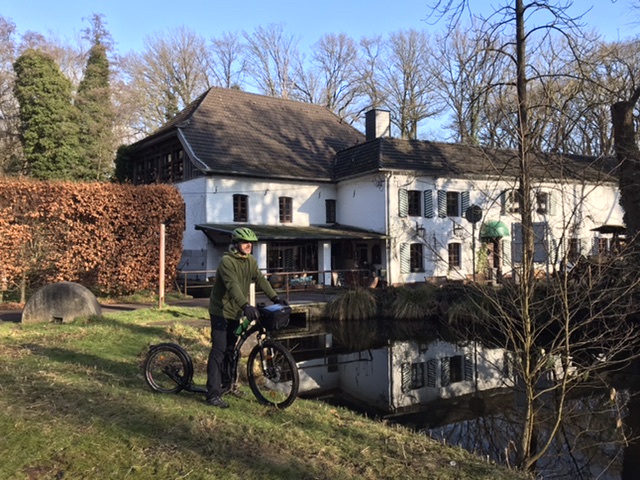 Wenn die Sonne rauskommt, geht’s aufs Trittbrett. Die günstige topographische Lage ermöglicht viele Touren in einem Radius von 360° Grad. Eine schöne Strecke führt über Waldwege durch das Naturschutzgebiet nahe der Schwalm bis nach Wegberg, unser gestriges Ziel.