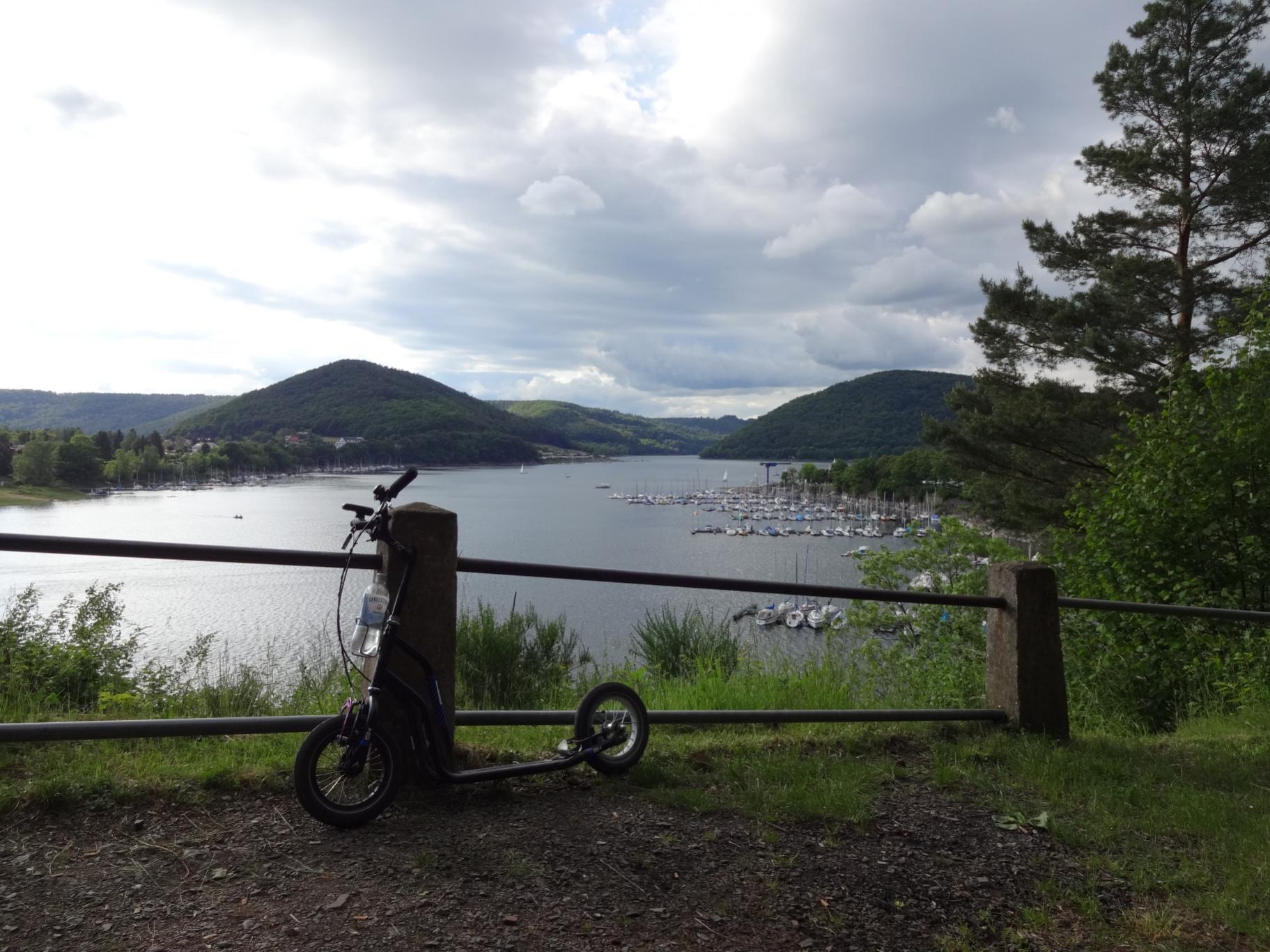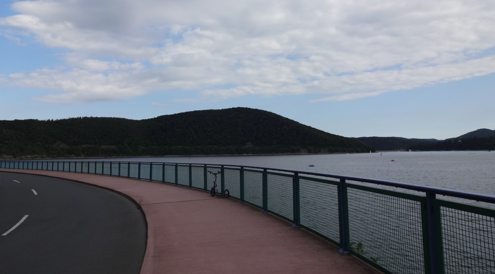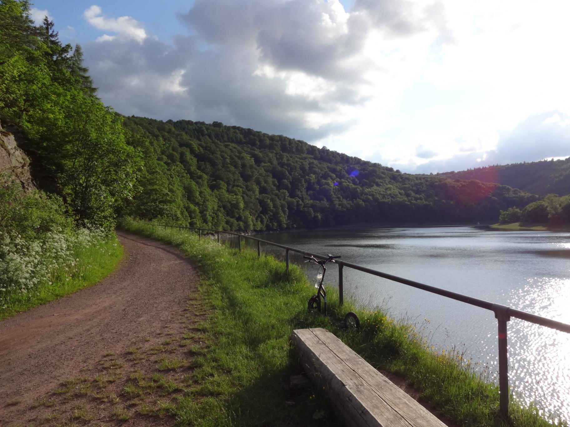In Adenau gab es die Wahl zwischen Nürburgring und Hillesheim. Letzteres gewählt und geschoben, geschoben, geschoben. Wenigstens wurde ich oben durch eine schöne Aussicht belohnt - bevor ich weiter durch den Wald bergauf schieben durfte. Um dann festzustellen, dass der Weg auf der Landstraße endet. Endstation. Und Retour. Und auch bergab noch geschoben. Die kleinen Felgen werden verdammt schnell glühend heiß!