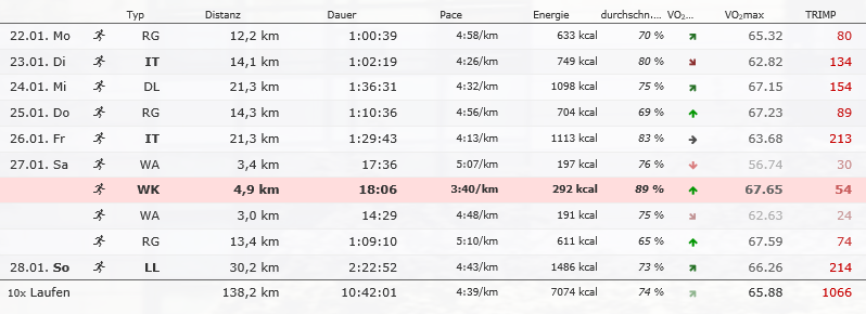 Heute langer Lauf und runde 138km, 10h 42min. Jetzt noch eine Woche, dann wird runtergefahren für HM am 11.02.