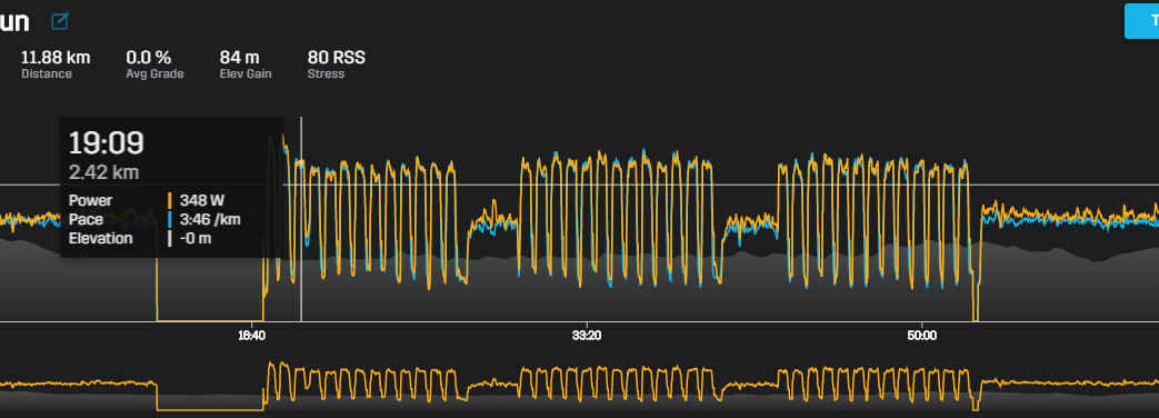 Ich gehe mal eher von 3:10er Tempo in den schnellen Abschnitten aus, das ist aber eine reine Schätzung von mir... auch trotz Stryd würde ich mich bei so kurzen Sachen nicht auf die Paceangaben verlassen.