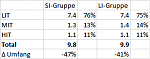 Während der 3 Wochen der Intervention ergab sich folgendes Bild (∆ Umfang: Veränderung in der Gesamttrainingsdauer verglichen mit den 3 Wochen vor Interventionsbeginn): (hier betrug die Standardabweichung (wieder nur auf LIT bezogen) für die SI-Gruppe 2.3 h, für die LI-Gruppe nur 1.0 h)