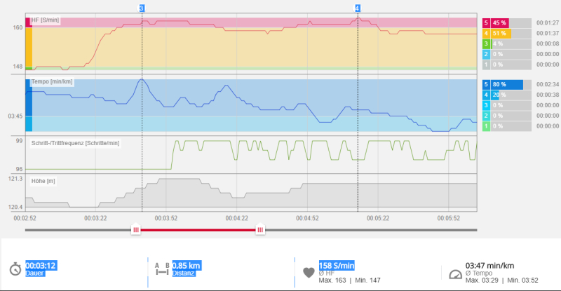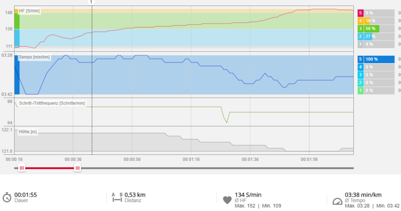 Es liegt nahe, dass ich zu schnell angegangen bin. Sehr wahrscheinlich ist das auch wirklich so. Ich habe mal weiter in die Daten geschaut. Das ist der Bereich ab ~80m bis 600m. Auch wenn man diese GPS-Daten immer mit einer Portion Vorsicht betrachten muss, so ist offensichtlich, dass hier jemand mit ganz viel Adrenalin unterwegs war. Denn unterwegs fühlte sich das wie spazieren an. Ohne Quatsch, die ersten 600m gingen wirklich locker von der Hand, Aber eigentlich waren sie im hochroten Bereich. 3:30 ist (noch) nicht meine Welt.