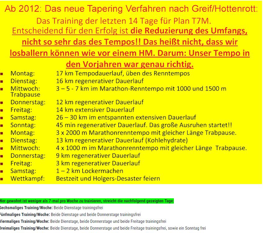Zur Frage, ob man die Tempoläufe nicht schneller laufen kann. Ohne Rücksprache mit Jens würde ich das auf keinen Fall machen. Die Belastung äußert sich nicht nach einem einzigen Templauf, sondern summiert sich. Es bringt überhaupt nichts, alles schneller zu machen als angegeben, in eine Frühform hineinzulaufen und zum geplanten Wettkampf dann platt oder gar verletzt zu sein (dieses Forum ist voll mit solchen Beispielen). Wenn einem bei den Tempoläufen langweilig ist, würde ich Jens schreiben. Das kann passieren, wenn die Steuerzeit aus einem Wettkampf stammt, den man schon vor zwei Jahren gelaufen ist.