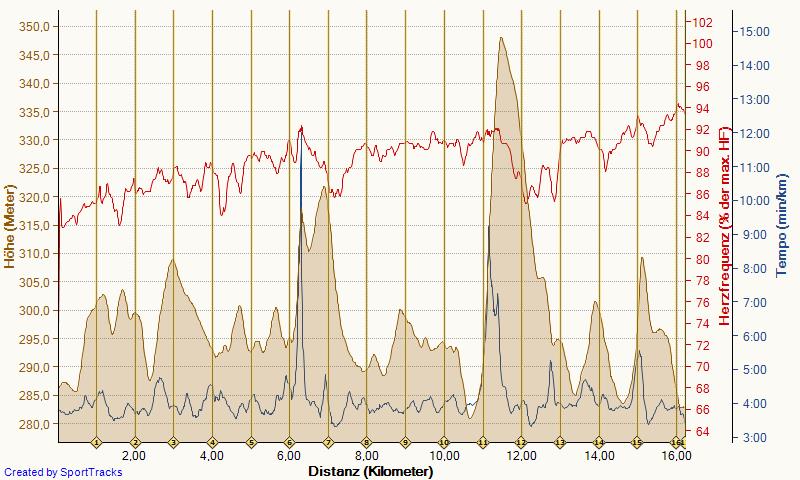 Der Herbst hat eigentlich recht versöhnlich begonnen. Ende September reichte es zu 37:00 über 10 km. Ende Oktober war eigentlich eine 36 vorgesehen, aber da hat mir ein Infekt einen Strich durch die Rechnung gemacht. Seit gestern habe ich wieder richtig gute Laune. Da fand mein Lieblingswettkampf statt. Mit 1:06:xx über 16,5 km bin ich mehr als zufrieden, zumal die Strecke durch die schöne Eifel führte und deshalb stellenweise etwas uneben ausfiel. Hier mal eine Grafik zur Ansicht: