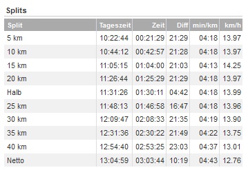 Hier noch meine Splits - km 10 bis 15 waren mit leichter negativer Höhendifferenz