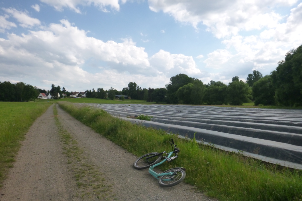 Gestern gab es keine Überlegung welchen Roller ich nehmen sollte, denn das Kickbike war platt. Diesmal bin ich zu den Spargelfeldern gefahren, die ich vor einiger Zeit nicht gefunden hatte. Aber im Saarland ist ja keine Spargelgegend, da gibt es höchstens einzelne Felder dort wo Sandboden ist. Das erste Feld war zugedeckt und das nächste hielt ich von weitem für eine Wiese, da ist der Spargel einfach gewachsen ohne geerntet zu werden.