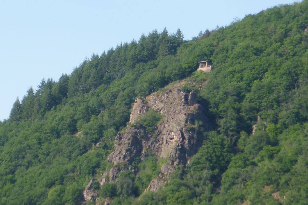 Die Abfahrt war ziemlich lang und ich habe viel gebremst. Aber zum Glück hatte ich den Tektoss mit den guten Bremsen dabei. Bei der Abfahrt konnte ich den großen Felsen (Vogelfelsen) mit der Hütte dann von unten richtig sehen. Und auch von der Fahrradbrücke über der Saar konnte man gut sehen dass die Fichten am Hang wohl alle gefällt werden müssen.