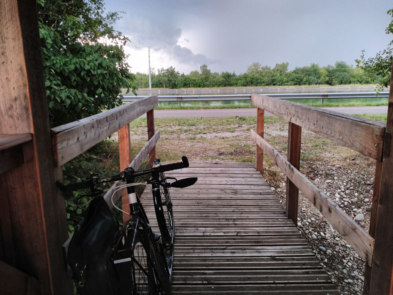 Grand Canal d'Alsace, erst sah es so aus, als wenn das Gewitter vorbei ziehen würde, dann kam es aber mit voller Wucht als Gewitter- & Hagelsturm runter, zum Glück konnte mich aber gut unterstellen. Als der Sturm vorbei war, wurde es sofort wieder dampfend schwül heiß.