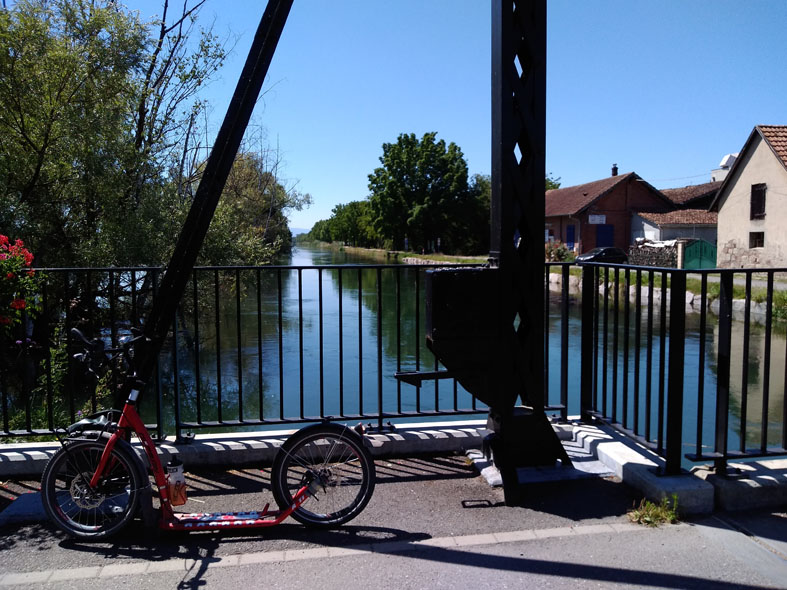 Ein ideales Roller-Terrain für solche heiße Tage ist das Gebiet südöstlich von Mulhouse (FR). Zum einen der topfebene Hardtwald mit seinen kilometerlangen, asphaltierten schattigen Waldsträßchen, auf denen keine Autoverkehr zugelassen ist und zum anderen die perfekten Radwege entlang des Grand Canal D'Alsass, Canal D'Huningue und Canal du Rhone au Rhin. Meistens parke ich am Stauwehr Märkt am Rhein in Deutschland und rollere dann auf dem Stauwehr über die Grenze nach FR auf die Kanalinsel. Dort geht es dann erst mal 6km direkt am Grand Canal schnurgerade geradeaus, immer am Wasser entlang und im Schatten der Bäume. Bei Kembs geht es dann in den Hardtwald, eben und schön schattig. Wenn ich bis nach Mulhouse rollere und dort noch ein bisschen an der Ill und in der Stadt rumrollere, komme ich schnell auf 80km, ganz locker & easy.