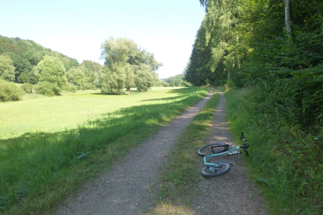 Heute morgen habe ich eine richtig schöne Tour gemacht. Es war in der Nähe von Zweibrücken an der Grenze zu Rheinland-Pfalz. Eine schöne schmale Strasse führte durch ein grünes Tal zu einem kleinen Ort. Die Steigung war nur gering, so dass ich die ganze Zeit treten konnte.