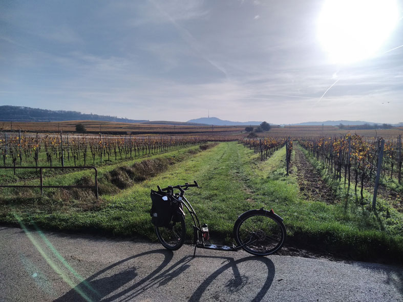 Heute war bei Traumwetter mal wieder eine meiner Lieblingstouren fällig, die Runde um den Kaiserstuhl. Die bin ich schon x-mal gerollert, aber es gibt immer wieder neue Varianten und Erlebnisse. Der Kaiserstuhl gilt als eine der wärmsten Regionen von D, heute am 30. Oktober war ich in Sommer-Minimal-Bekleidung unterwegs, so liebe ich es. 56 km, 211Hm.[font="]
