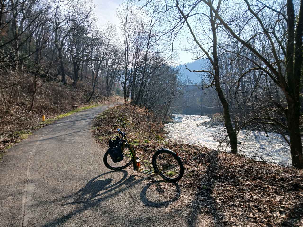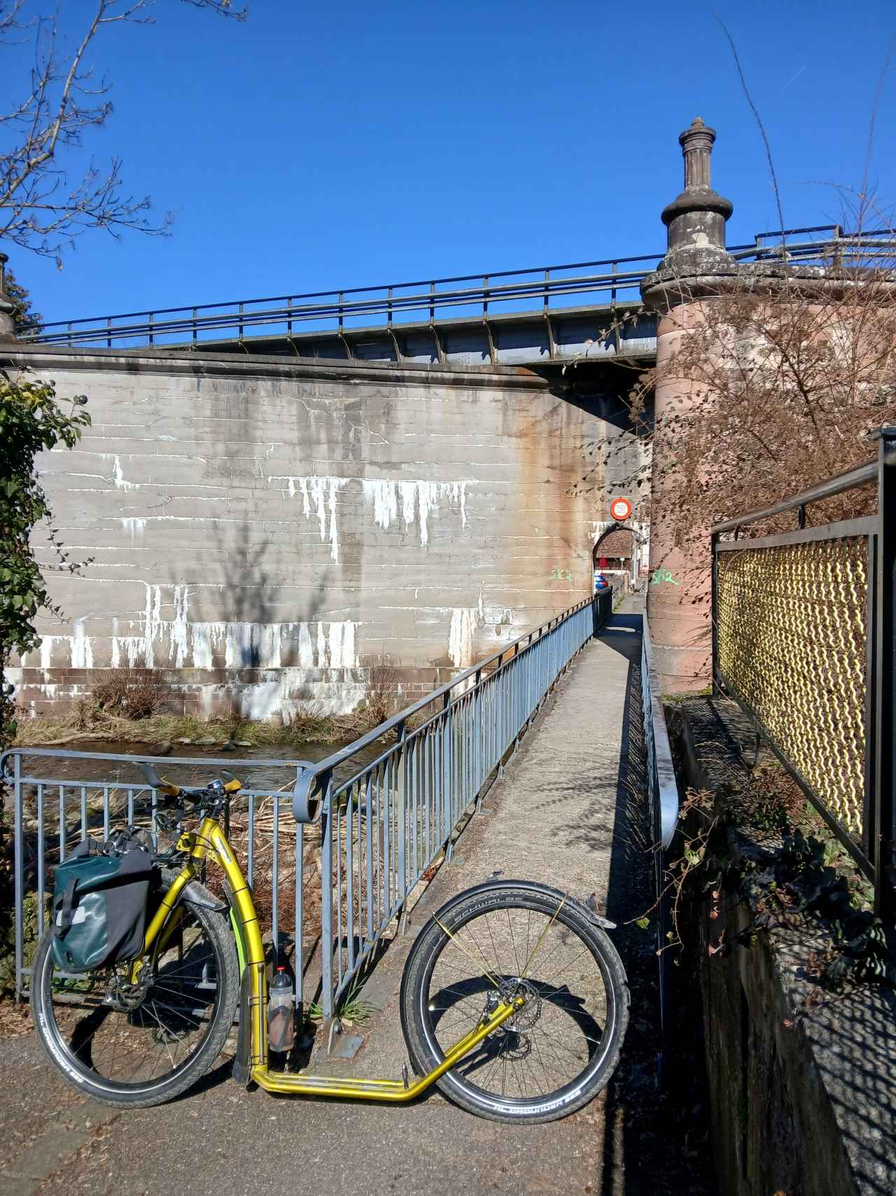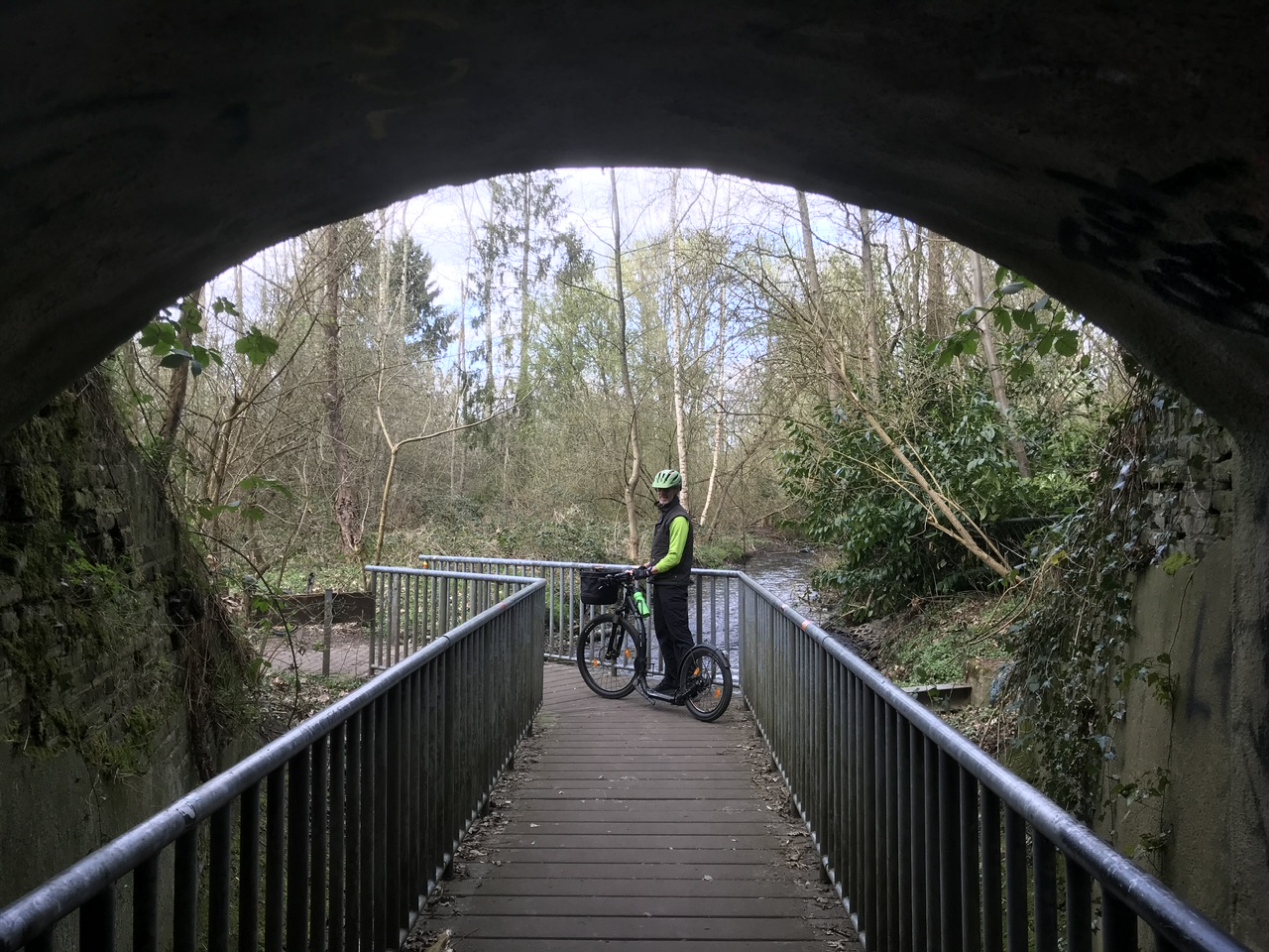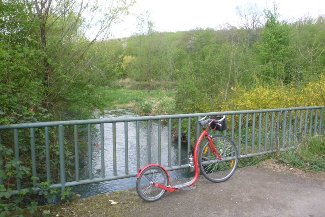 Radwege an Bahntrassen, Flüssen und Kanälen haben meistens wenig und relativ gleichmäßige Steigungen, also gut zu Rollern.