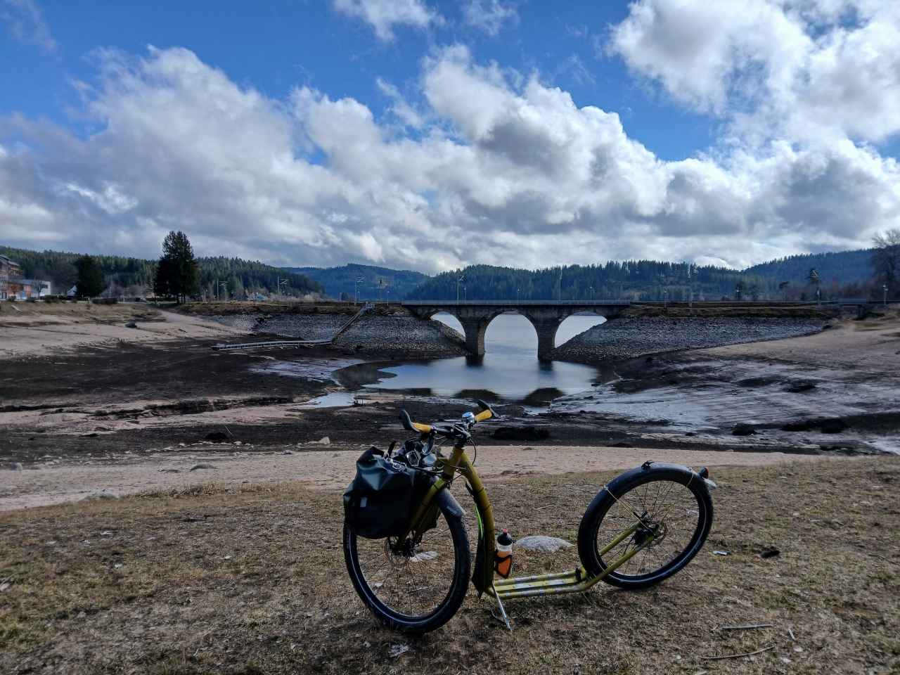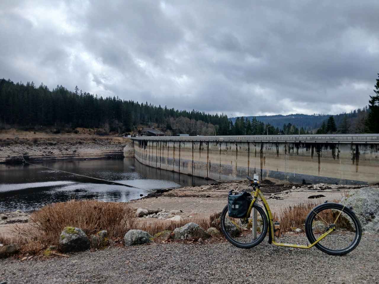 2663Der Schluchsee ist (lt. Schluchseewerk) der größte Stromspeicher Deutschlands und hat zur Zeit einen sehr niedrigen Wasserstand, dass wollte ich mir mal anschauen. Es gibt einen schönen Radweg rund um den See, der sich gut rollern lässt, 18km einmal rund herum. Der See liegt auf über 900Hm, dadurch lagen zum Teil noch Schneereste auf den Wegen, es war kein Problem zu rollern.