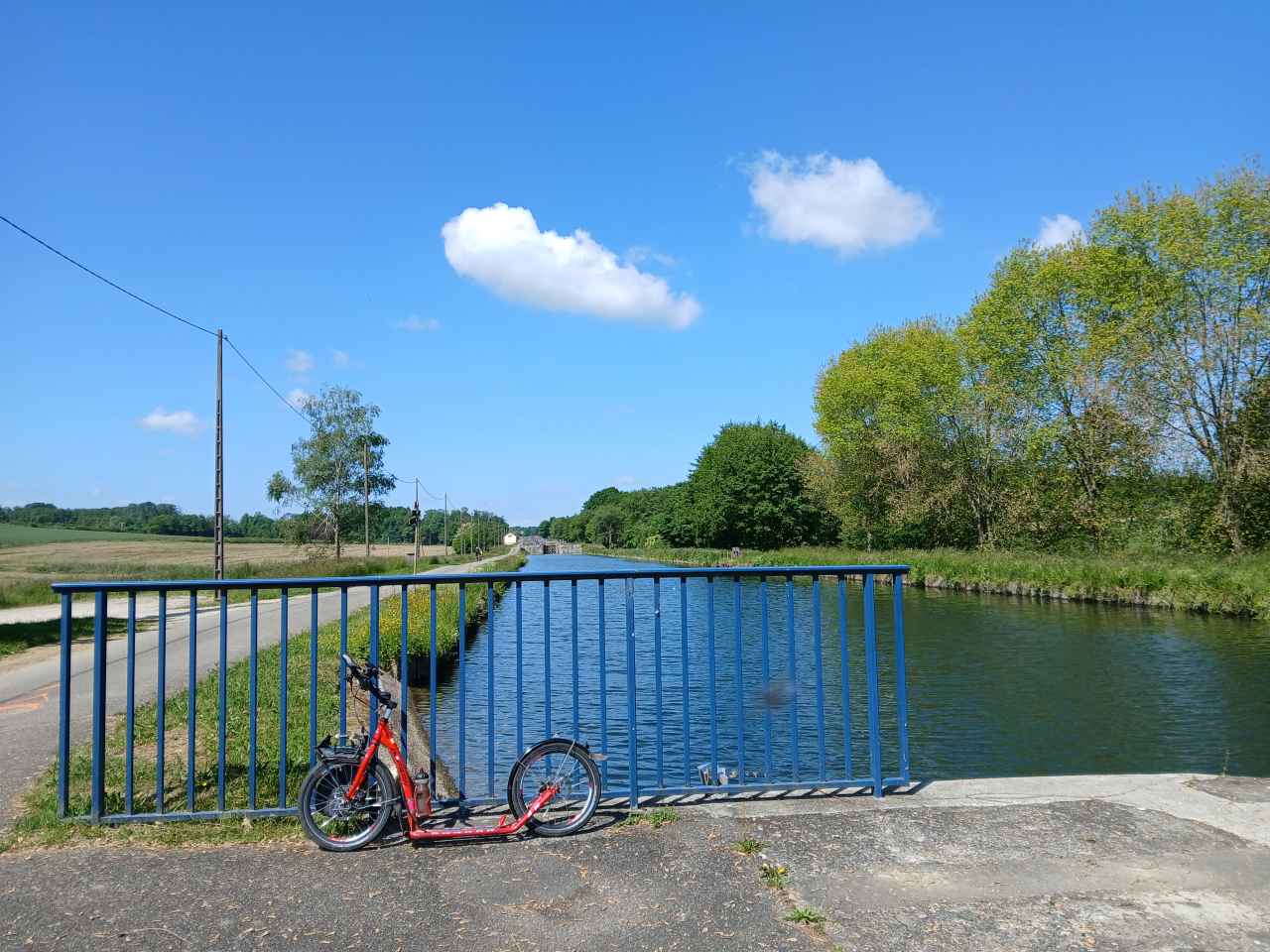 2689Heute bei perfektem Rollerwetter eine kleine Tour am Rhein-Rhone-Canal in der Region um Dannemarie. Der Radweg am Rhein-Rhone-Canal ist auch der Eurovelo 6, von Nantes nach Budapest. Dementsprechend sieht man viele Radtouristen, die auf großer Tour sind. Da bekomme ich auch Lust mal wieder auf eine große Tour mit Roller, Zelt & Schlafsack.