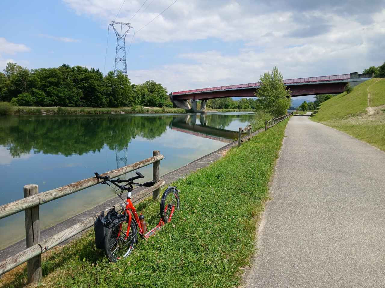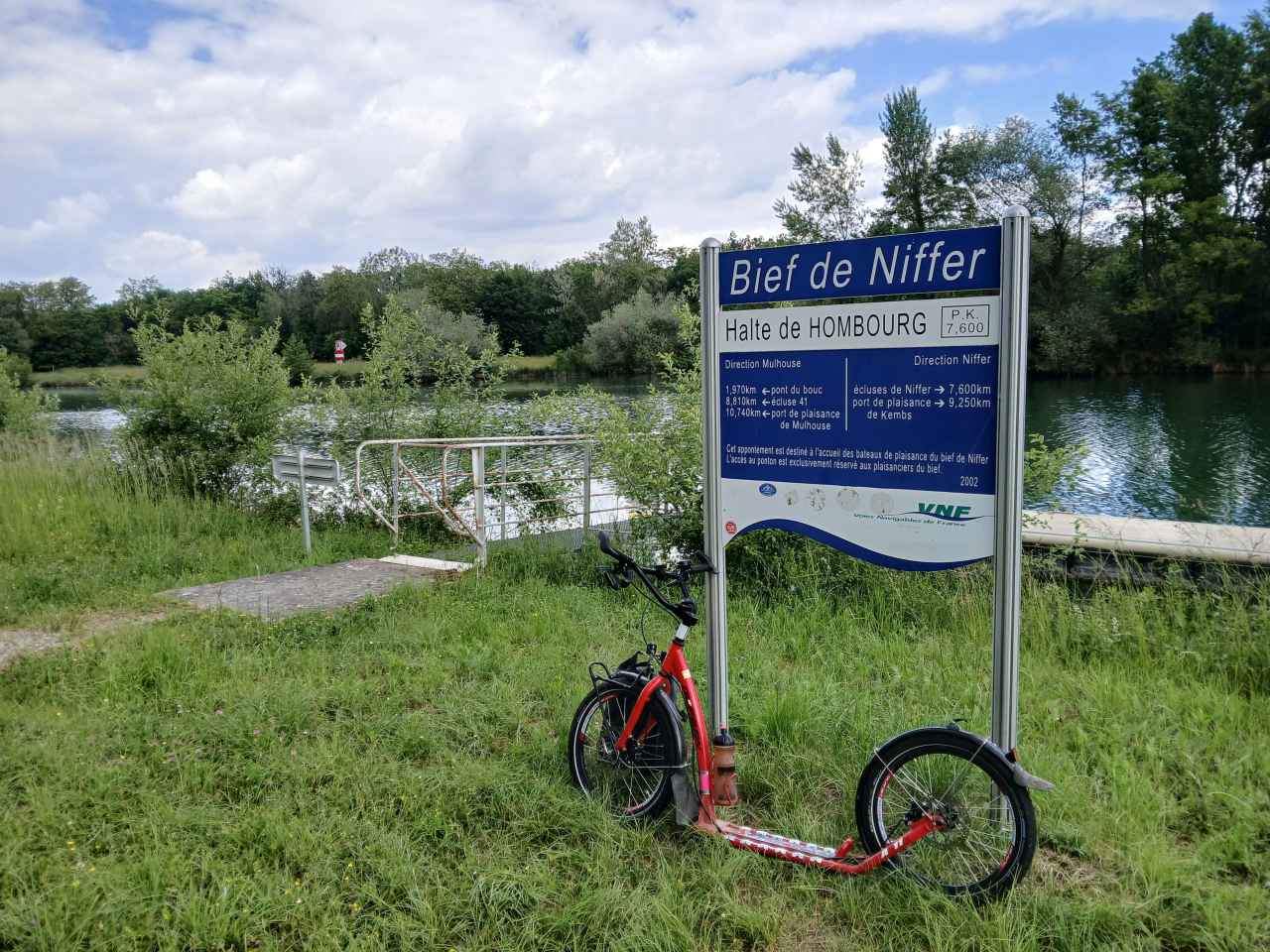 2690Heute wollte ich nicht so weit mit dem Auto anfahren, deshalb war ich mal wieder am Rhein-Rhone-Kanal. Gestartet bin ich in Kembs am Canal de Huningue, der in Niffer endet und in den Rhein-Rhone-Kanal übergeht. An dem ging es dann weiter Richtung Mulhouse bis zur Pont du bouc. Ab der Pont-du-bouc (Pont = Brücke) ging es dann durch den Hartwald zurück nach Kembs. Auf dem Weg durch den Hartwald geht es 8,5 km nur schnurgeradeaus, das kenne ich hier unten im Südwesten so sonst nicht. Mit 23 km mit 51 Höhenmetern eine ganz lockere Runde, alles gut asphaltiert. Die Strecke ist auch der Eurovelo 6, da habe ich heute mit Amerikanern gesprochen, die von Paris nach Budapest mit ihren Rädern unterwegs waren. Da bekomme ich auch wieder Reiselust mit dem Roller!