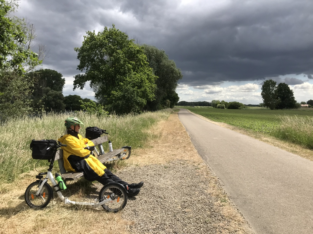 Um rasch auf ergiebige Regenschauern zu reagieren, hatten wir die großen Lenkertaschen an die Kickbikes geklickt und die praktischen Regenponchos eingepackt.