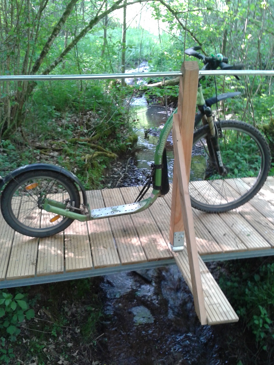 Bergauf mache ich das genauso, schieben und gehen, weil das meiste steil ist und ich nicht so wirklich fit bin. Wenn es nicht ganz so steil ist, geht auch fahren bis es zuviel wird, dann wieder gehen und wieder fahren. Das stört mich aber nicht wirklich, nur kann ich keine weiten Strecken fahren, meistens sind es unter 20 km. Beim Tektoss sind es 3 Faktoren, die bremsen: das hohe Trittbrett von ca. 14 cm, das Gewicht von 12 kg und die Reifen, wobei ich glaube dass die Reifen auch einen ziemlichen Einfluß haben. Aber es ist kein so riesiger Unterschied zum Kickbike im Wald, auch damit ist es schwer bergauf zu fahren. Aber ein Berg hat auch sein Gutes, man findet meistens eine schöne Abfahrt und der Tektoss macht bergab richtig Spaß