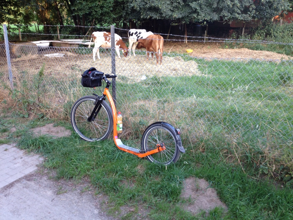 Oh oh. Meine erste Tour mit dem Roller war vor ein paar Wochen. Mittags von der Arbeit zurück. Ob's stimmt weiss ich nicht, aber mein Fahrradcomputer zeigte 39,9 C an ! Die 10 km gingen noch aber den letzten km, einen echt steilen Berg, hochschieben hat mich fast umgebracht - hatte ständig Phantasien von freundlichen Mitmenschen die mich und meinen Roller mit hoch nehmen würden...alternativ, dass ich mich beim nächsten Garten einfach hinters Mäuerchen schmeisse und liegen bleibe. Deshalb bin ich heute lieber um 6:10 h zu einer Trainingsrunde aufgebrochen. Da wars noch kühl, ausser Katzen und Füchsen wenig los und auch den Berg kam ich besser hoch.