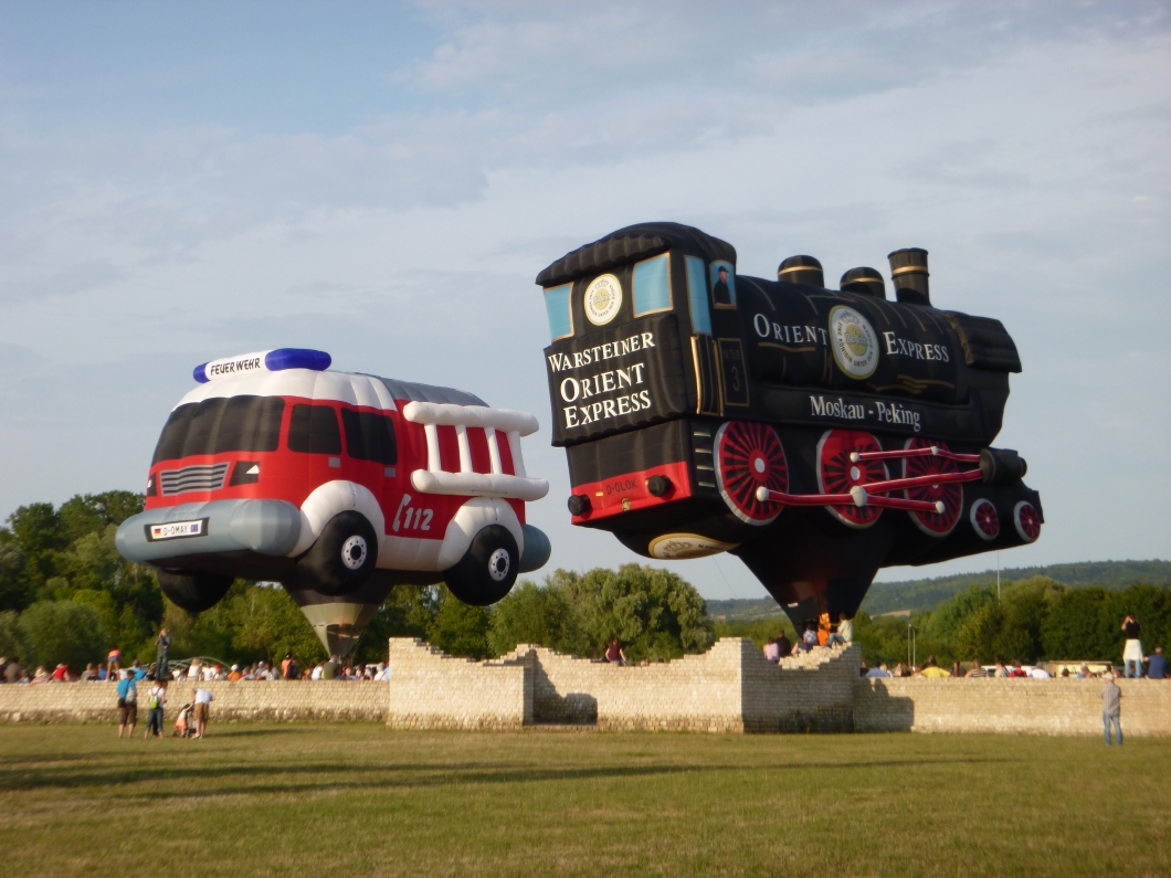 In Frankreich muß auf einem kurzen Stück ein Feld überquert werden. Dann geht es runter zur Ruine Frauenberg. Leider ist sie eingezäunt. Hier geht's über die Bliesbrücke nach Deutschland zurück. Ein schöner Radweg, hier stehen kilometerweit überall Walnußbäume, Apfel- und Zwetschgenbäume. Da müsste man im Herbst wiederkommen wenn alles reif ist. Ich war zu langsam und habe zu lange fotografiert. Jetzt sind die Ballons schon gestartet. In Bliesbruck-Reinheim gibt es keltische und römische Ausgrabungen und ein archäologisches Forschungszentrum, aber heute sind die Ballons, die auf der großen Wiese starten, interessanter. Ich habe noch Glück und 2 besonders schöne Ballons sind noch nicht gestartet: