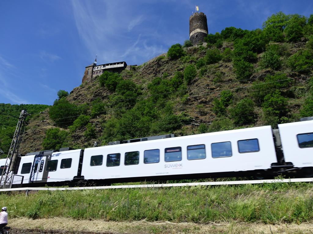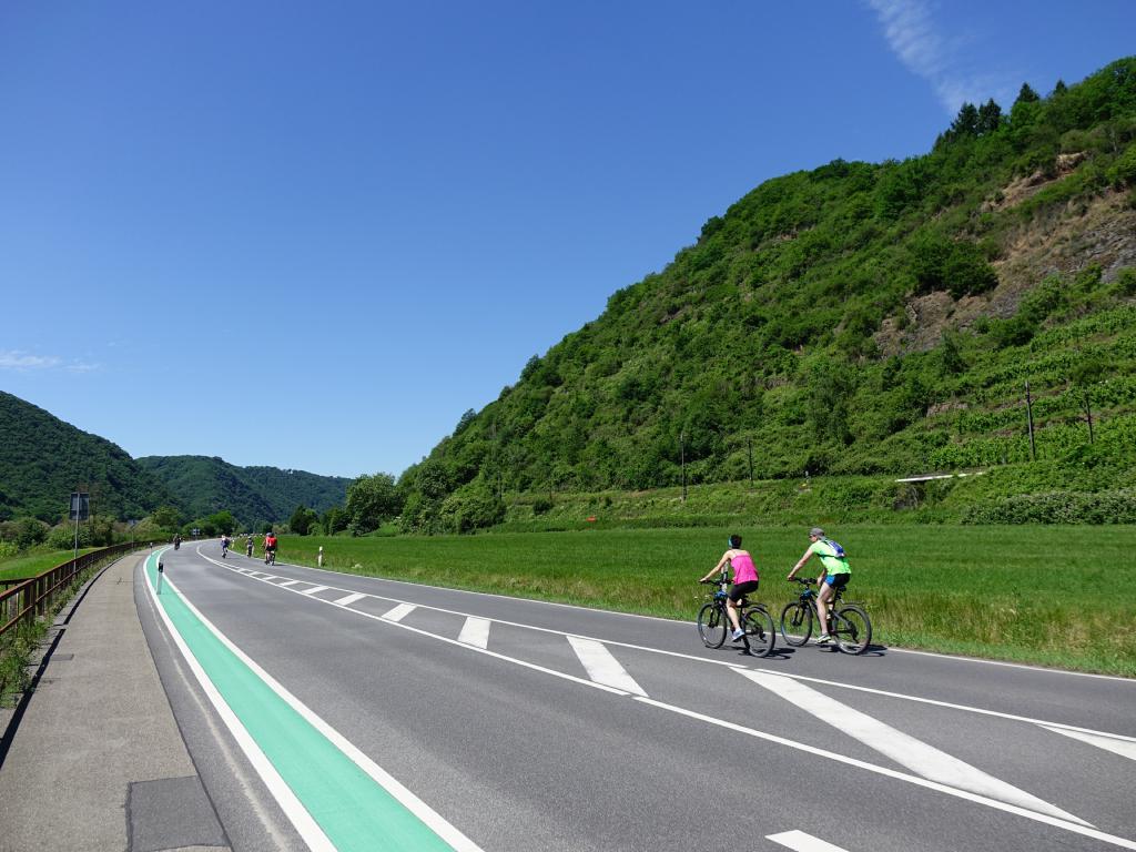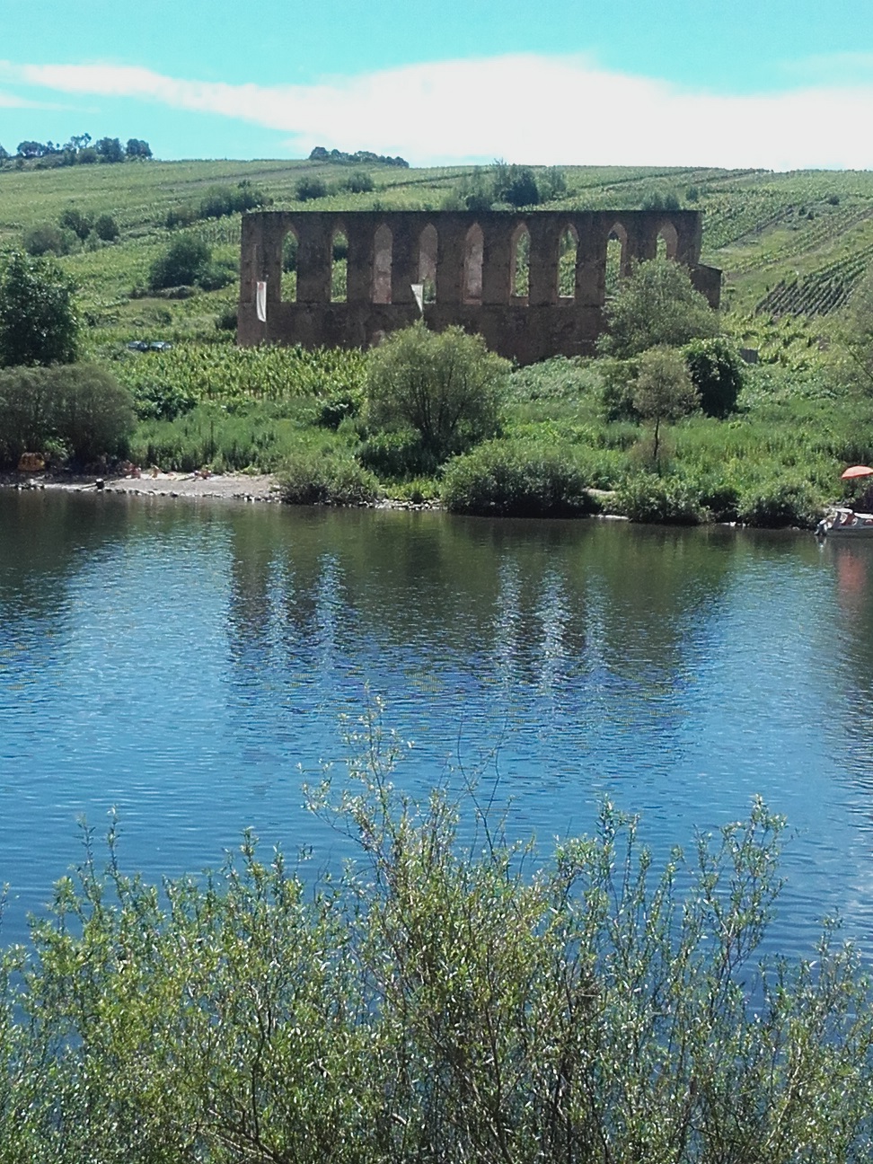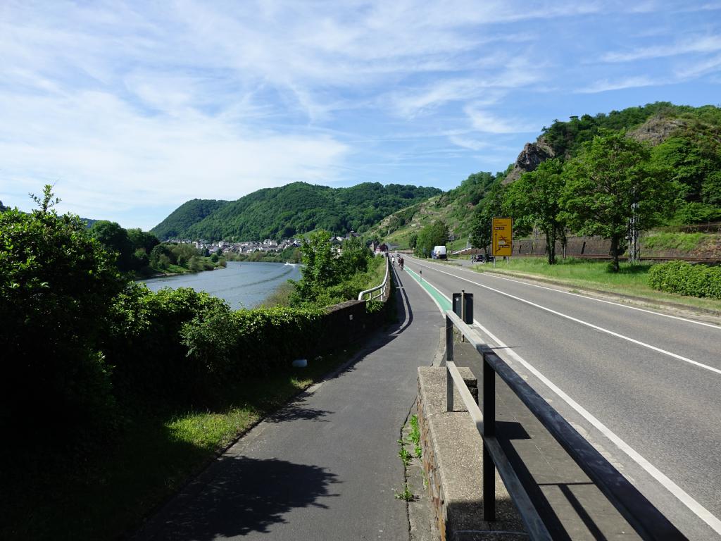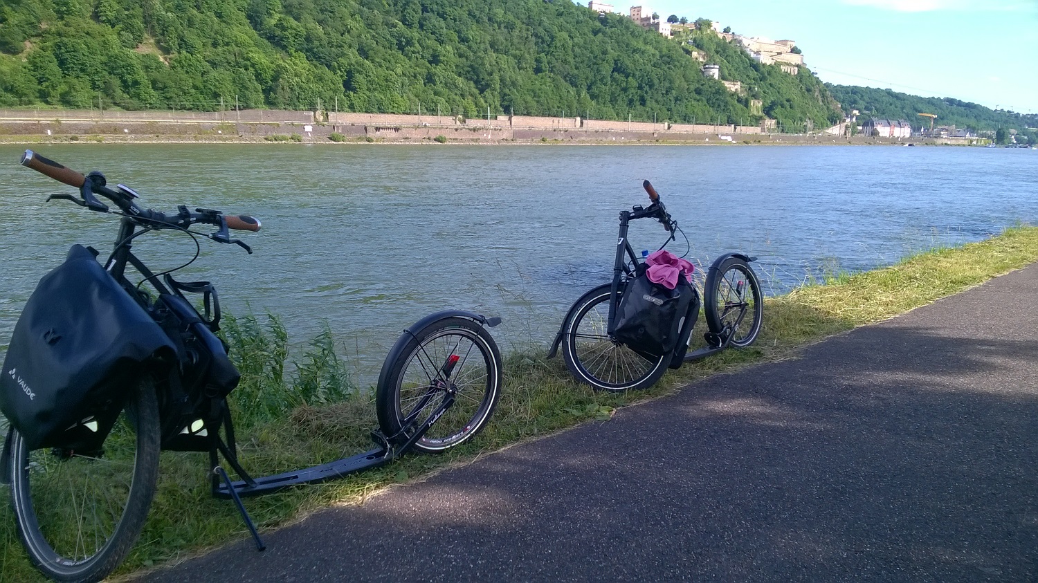 Bei einer Pause trafen wir dann ein junges sympathisches Wanderpaar, die von Venlo bis Koblenz mit riesigen Rucksäcken incl. Campingausrüstung nur 9 Tage brauchten. Sie wollen die Mosel hoch bis Trier wandern. Dann den Rhein entlang über den Schwarzwald bis zum Bodensee. Sie haben sich eine berufliche Auszeit von 3 Monaten gegönnt. Sie hatten beide Blasen an den Füßen und er eine Blase vom Rucksack auf der Schulter. Sie hätten gerne mit unseren Rollern getauscht.